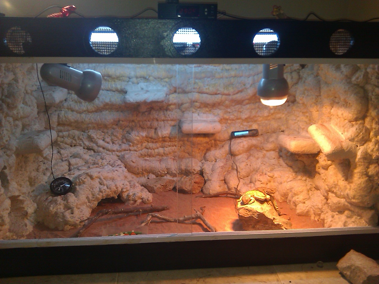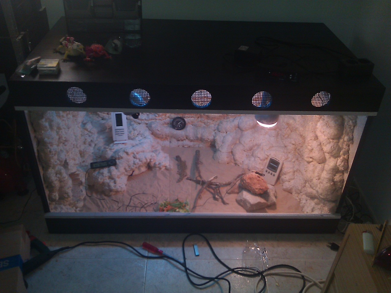 hola te eh echo caso pero los eh hecho en el frontal ,pero no se si va bien soy de mallorca y aqui hay mucha humedad de temperatura es verano y ya se sabe dentre del terrario bajo el foco estan ha 42ºgrados y en el estremo mas separado a 35,5ºgrados .tengo dos uromastyx dispar jovenes y ando preocupado por q los penia en otro terrario con techo descubierto y estaban mas activos no se si es por el cambio pero estan mas quietos sobre todo el macho bueno alguien q me aclare dudas por favor.aqui otro foto del invento con los agujeros
