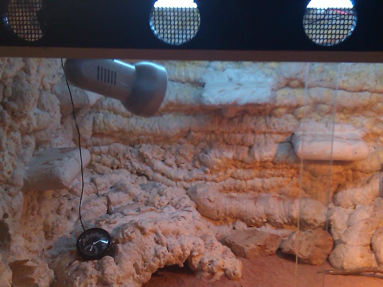 Y en segundo lugar te recomendaría que pusieras una o varias piedras grandes o algún tronco debajo del foco para que se puedan asolear y donde la temperatura llegue a los 55 o 60 grados que te lo agradacerán, esta temperatura sólo en un punto no vayan a quedarse frito, es que me da impresión que están muy lejos del foco.