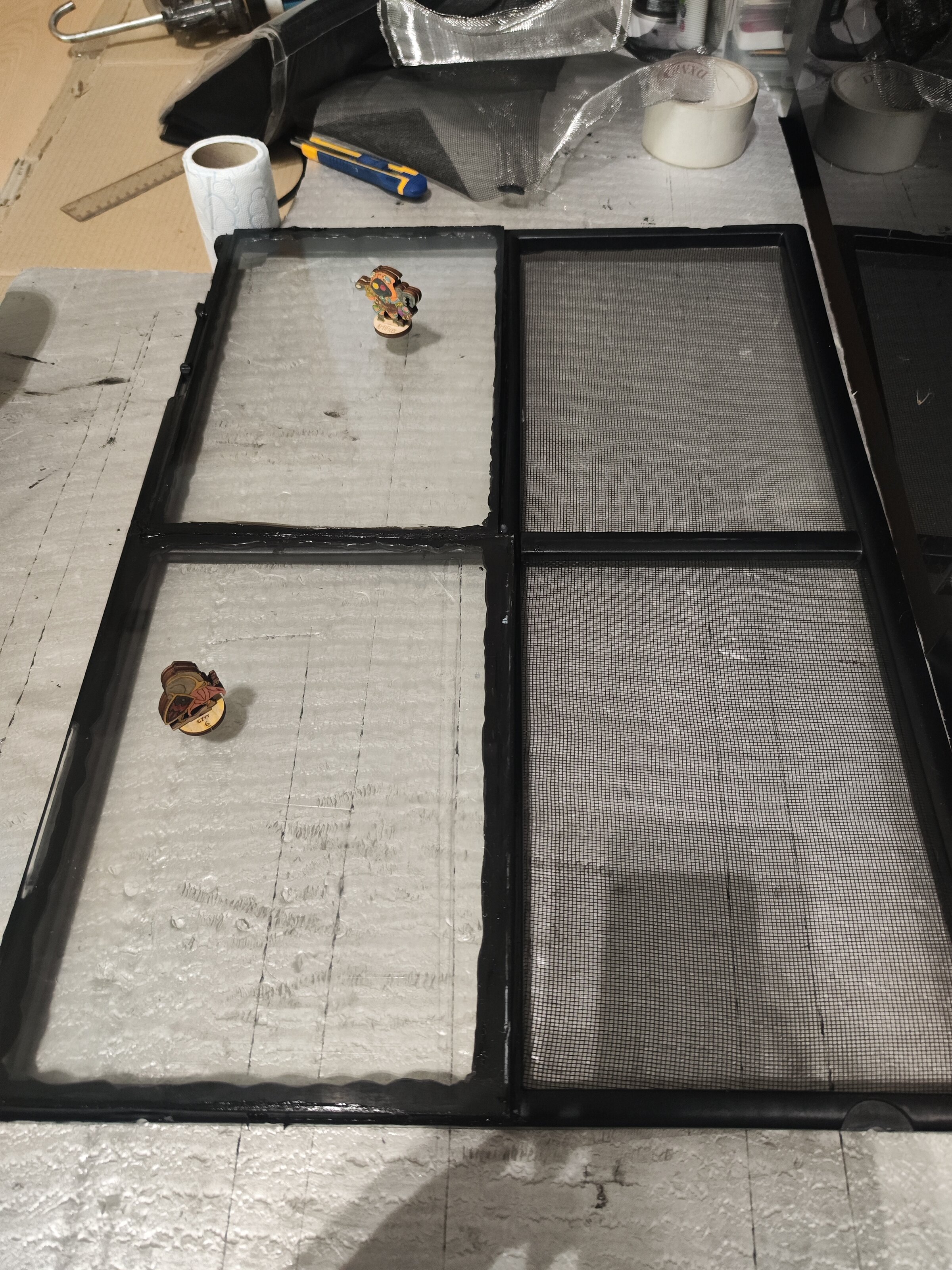 La parte frontal he sustituido la malla metálica que trae que da muy mala espina por mosquitera. Al usar las mismas gomas que ellos ponen ha quedado muy tensa. Y luego un cordón de silicona por encima de la goma y listo.