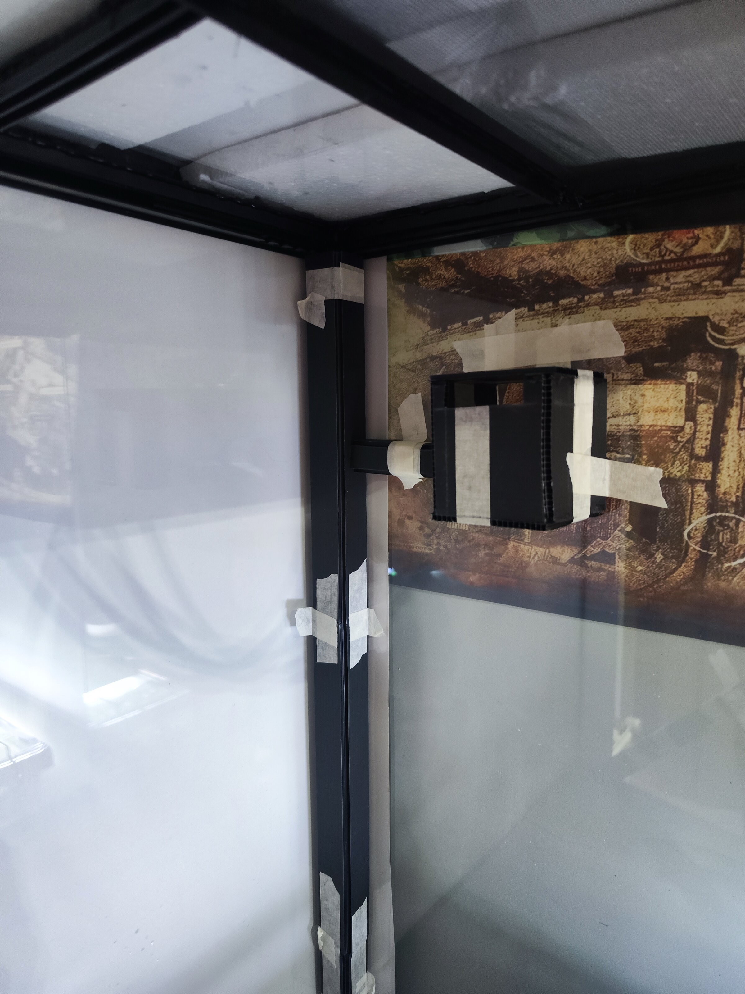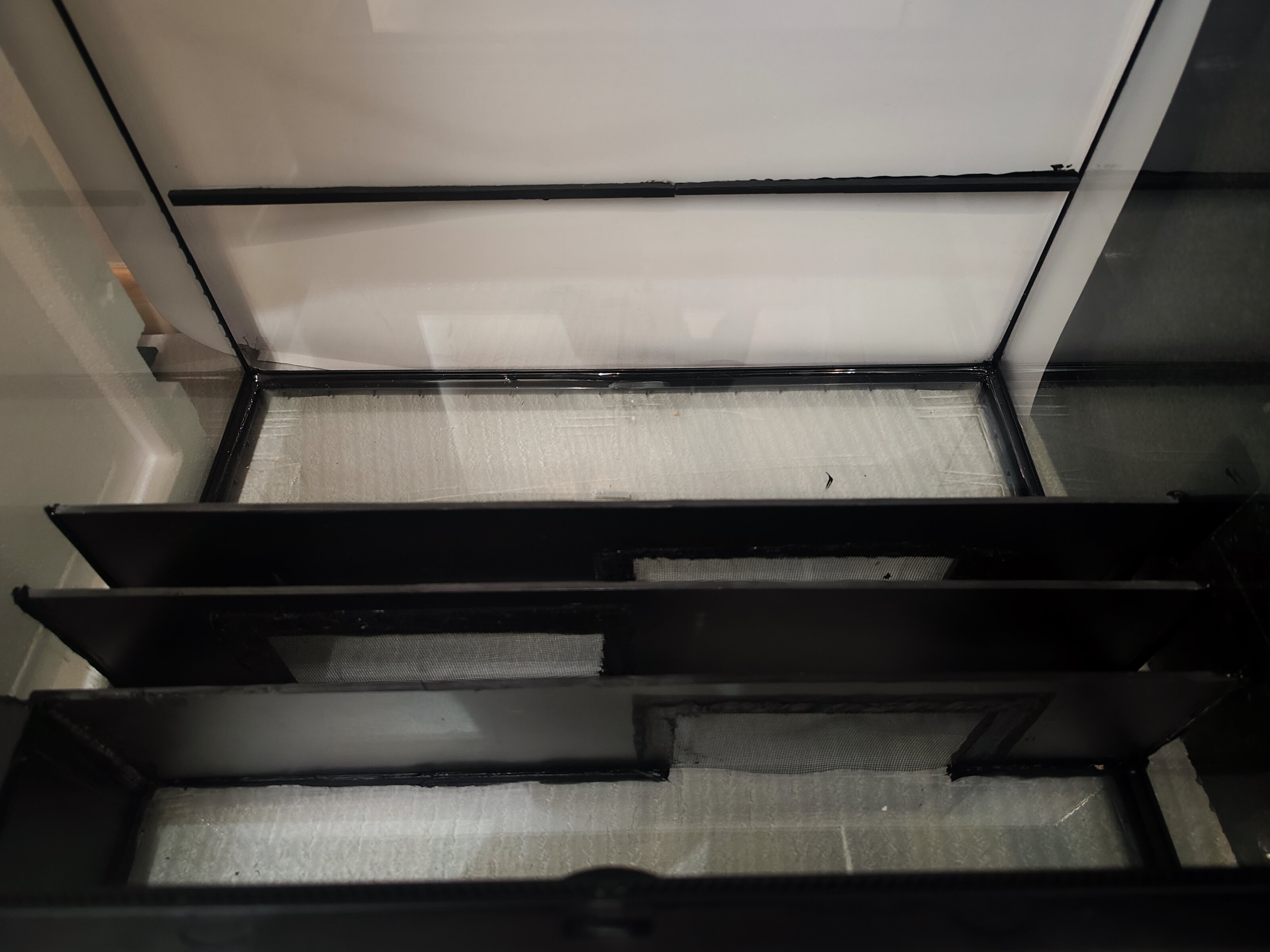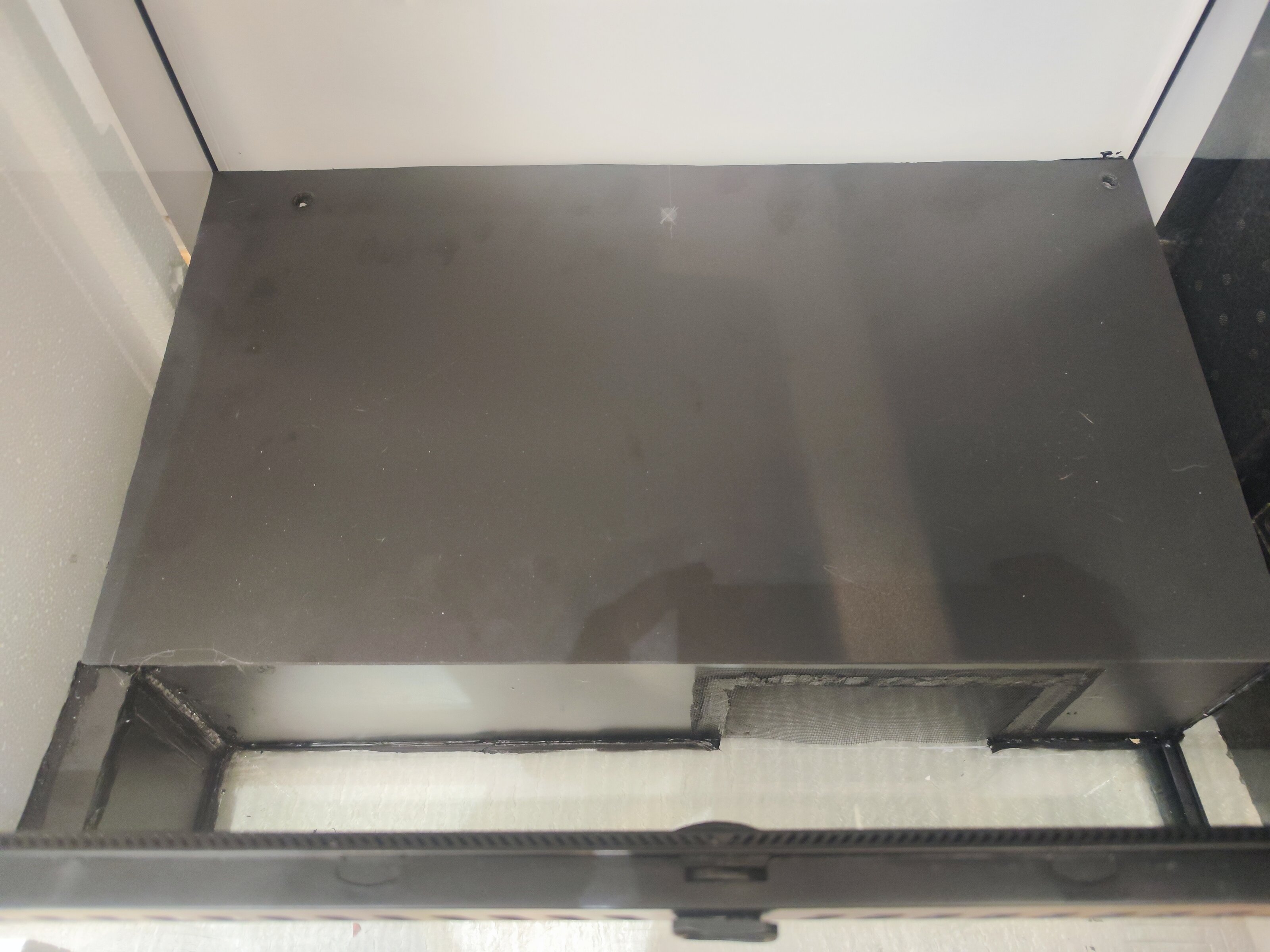 Para la parte trasera he cortado unos cristales que tenía de un acuario viejo y los he pegado con silicona. La lástima es que he sido incapaz de cortarlo de una sola pieza y así haber quitado el tirante negro que tiene en medio la tapa pero bueno, creo que no ha quedado tan mal. Os dejo foto