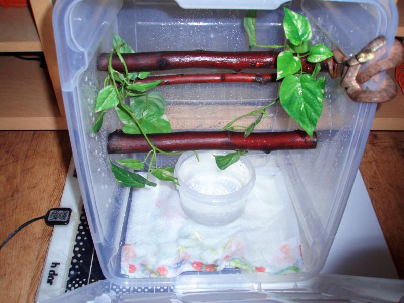 Marc ese tupper es ahora mismo donde vive, sus medidas deben ser 40 de alto x 30 x 30 de momento esta bien para ella y bueno un poquito mas para alante pues le pillare un terrario para arboricolas...