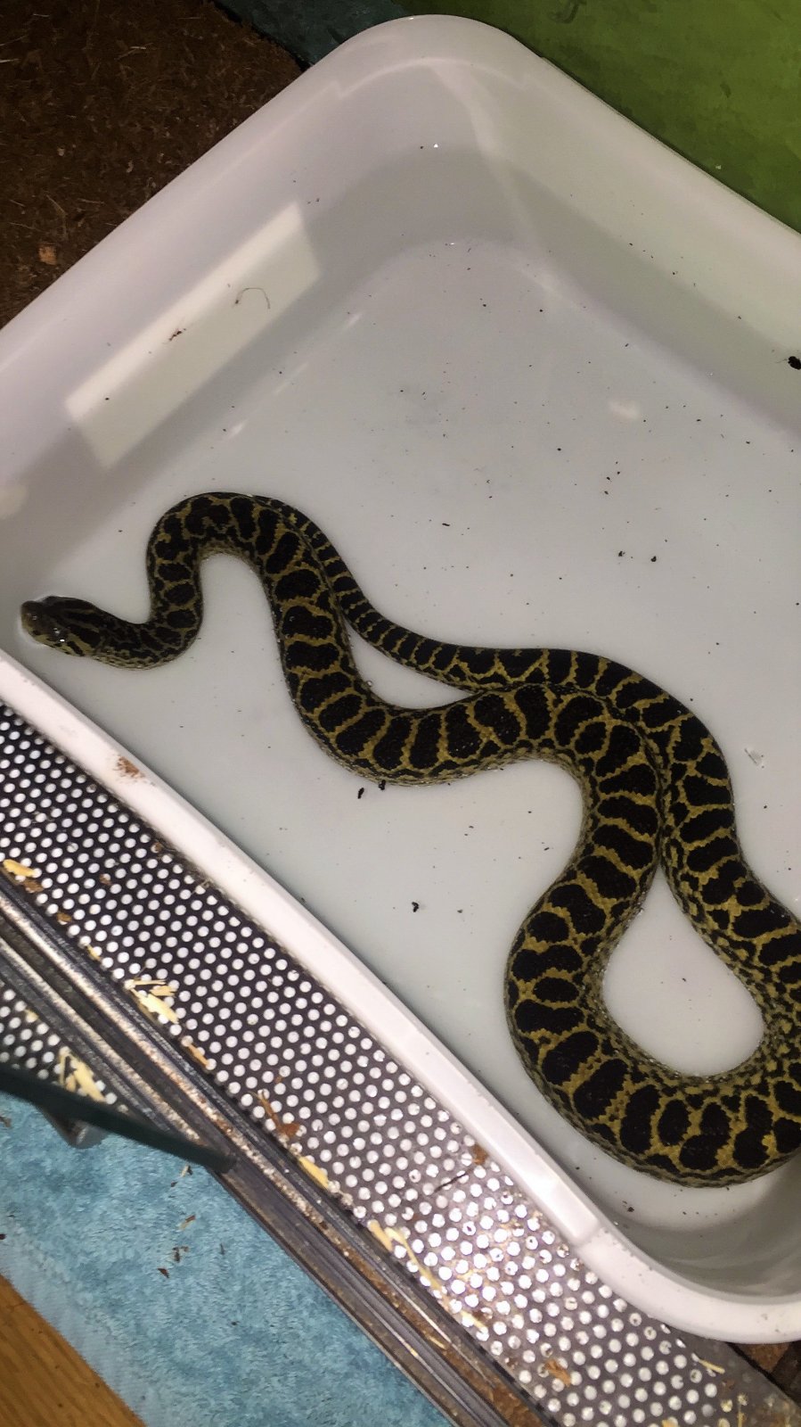 Yellow Anaconda cage requirements are a little easier to accommodate than other large constrictors with their smaller sizes. For Neonate Anacondas, I recommend using a smaller tub, something on the lines of a 6 qt or 15 qt tub. If using aquarium style caging, something on the lines of a 15‐20 gallon long would work. You don’t want to go too big at first, Anacondas are a very high stress snake, and tend to do better in smaller