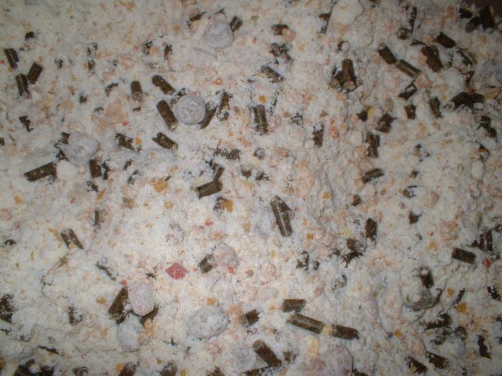 ... Y hablando del alimento.. yo que crío tanto para alimentar a otros animales como por gusto... no tengo una receta standard, pero más o menos siempre me sale una mezcla parecida.