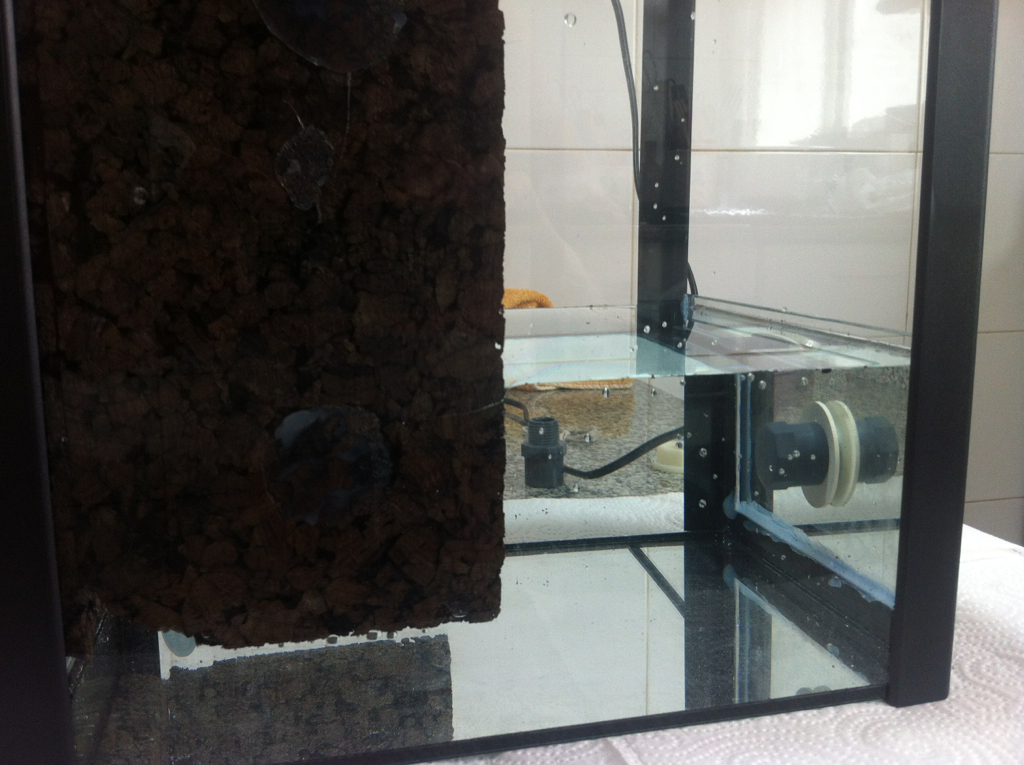 Una vez que vemos que no tiene fugas (tocamos madera), procedemos a instalar los imanes en el marco del acuario y en la puerta, así como a ensiliconar un perfil en L encima del marco (proceso del cual no tengo fotos). A su vez, para evitar cualquier eventual fuga de dorsos provocada por alguna rendija producto del cristal mal cortado por parte del cristalero, se insertan unas tiras de silicona adhesivas (que se venden para insertar entre las puertas correderas de los cristales) en el perfil en L y en el zócalo de arriba en la junta de la puerta: