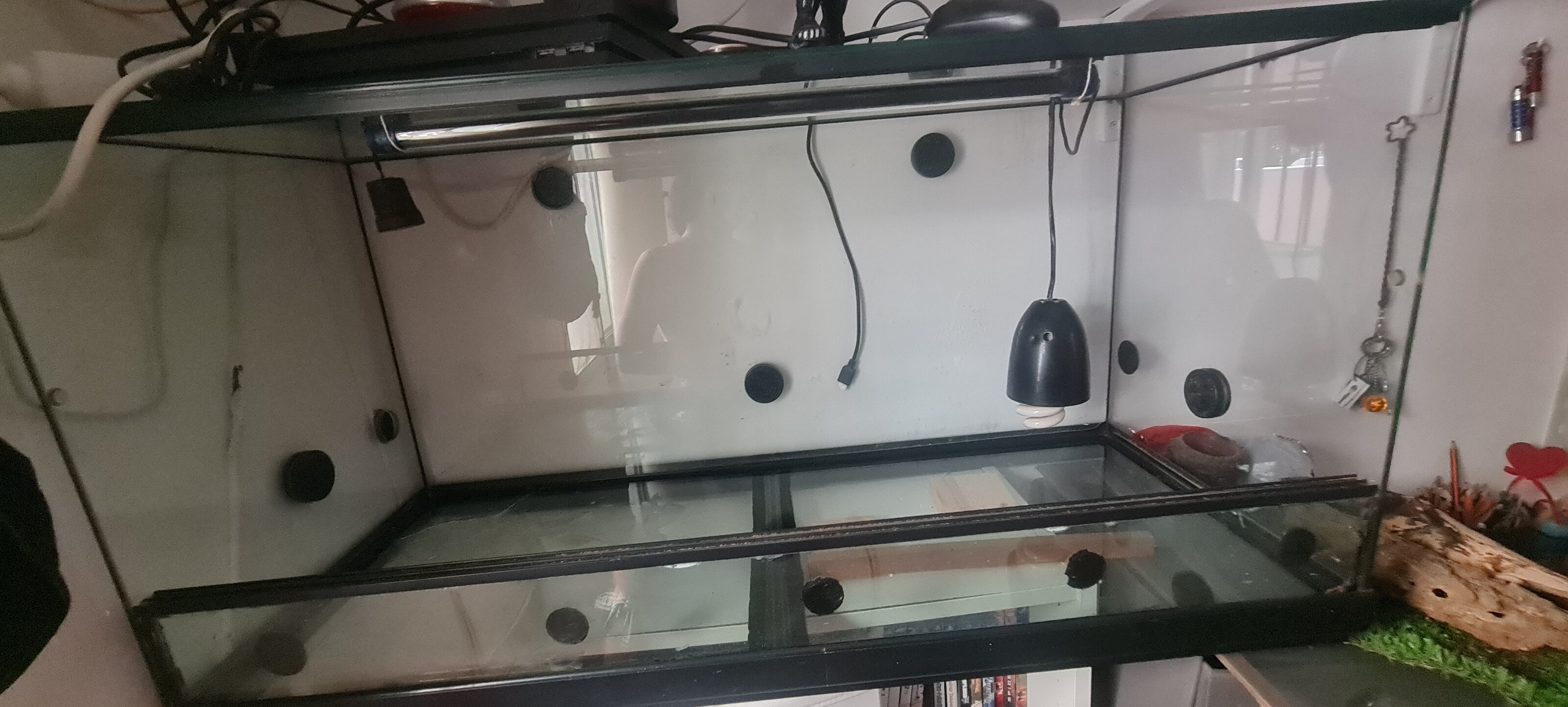 Hola, soy nueva el tema es que mis hijos tienen dos pogonas, emos tenido un problema de hormigas y emos tenido que desmontar todo el terrario, aprovechando que están en el terrario de exterior para hacer un cambio y ya que emos perdido todo el fondo que teníamos, emos estado viendo muchos vídeos de como hacerlo con espuma de poliuretano pero tengo dudas sobre las luces que tenemos y nose si podríamos ponerla mejor ya que es de cristal entero y tiene las perforaciones echas os enseño alguna foto y las medidas del terrario son 1 metro de largo x 50 de alto x 40 de ancho, mi idea es hacerle fondo rocoso para que puedan trepar y alguna plataforma arriba, en la foto la luz se ve caída porque ahora mismo no está sujeta no se le pone asín de baja normalmente. Gracias