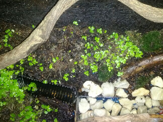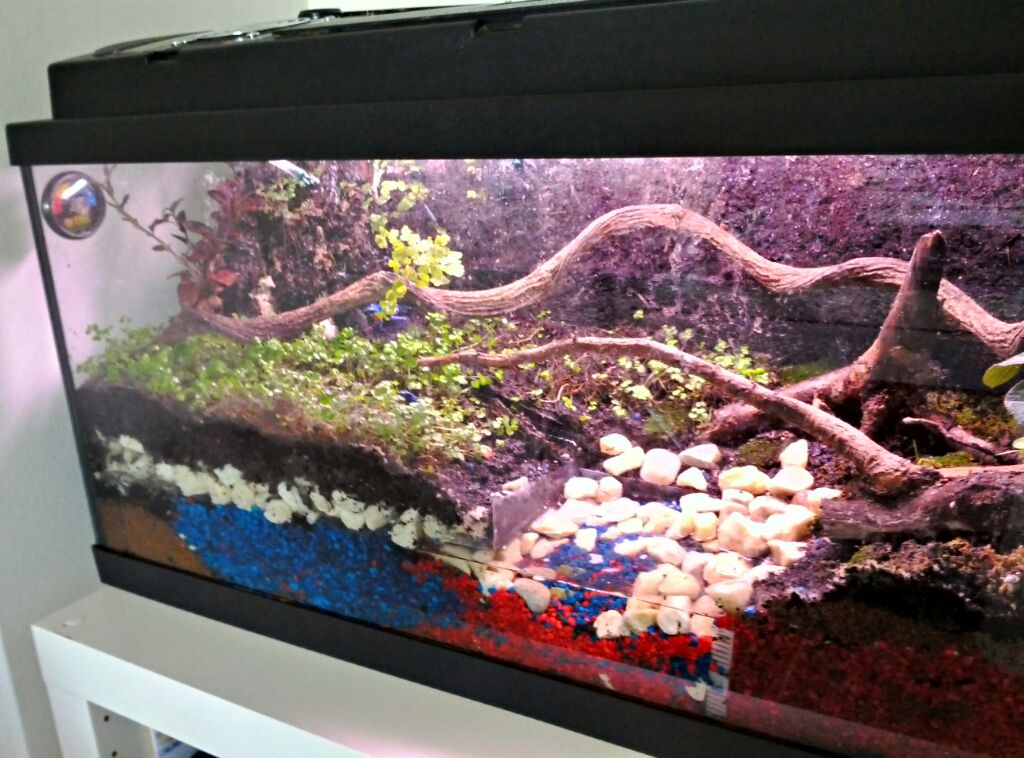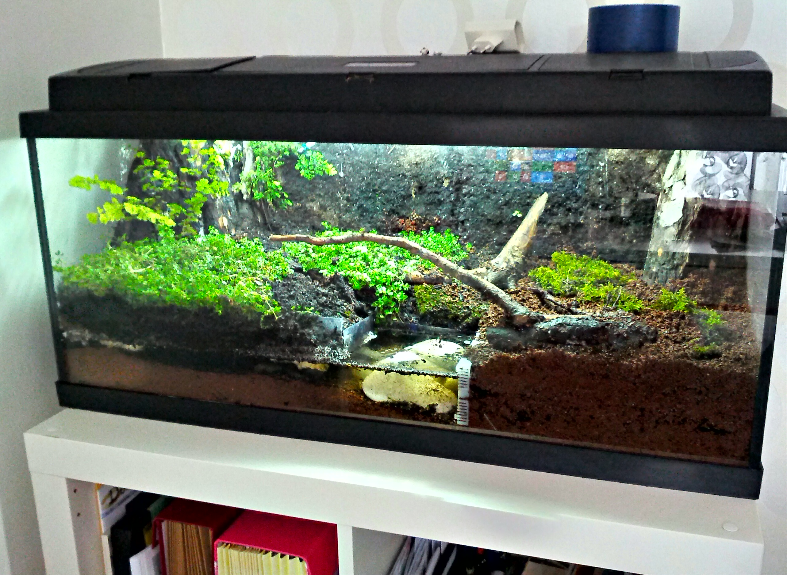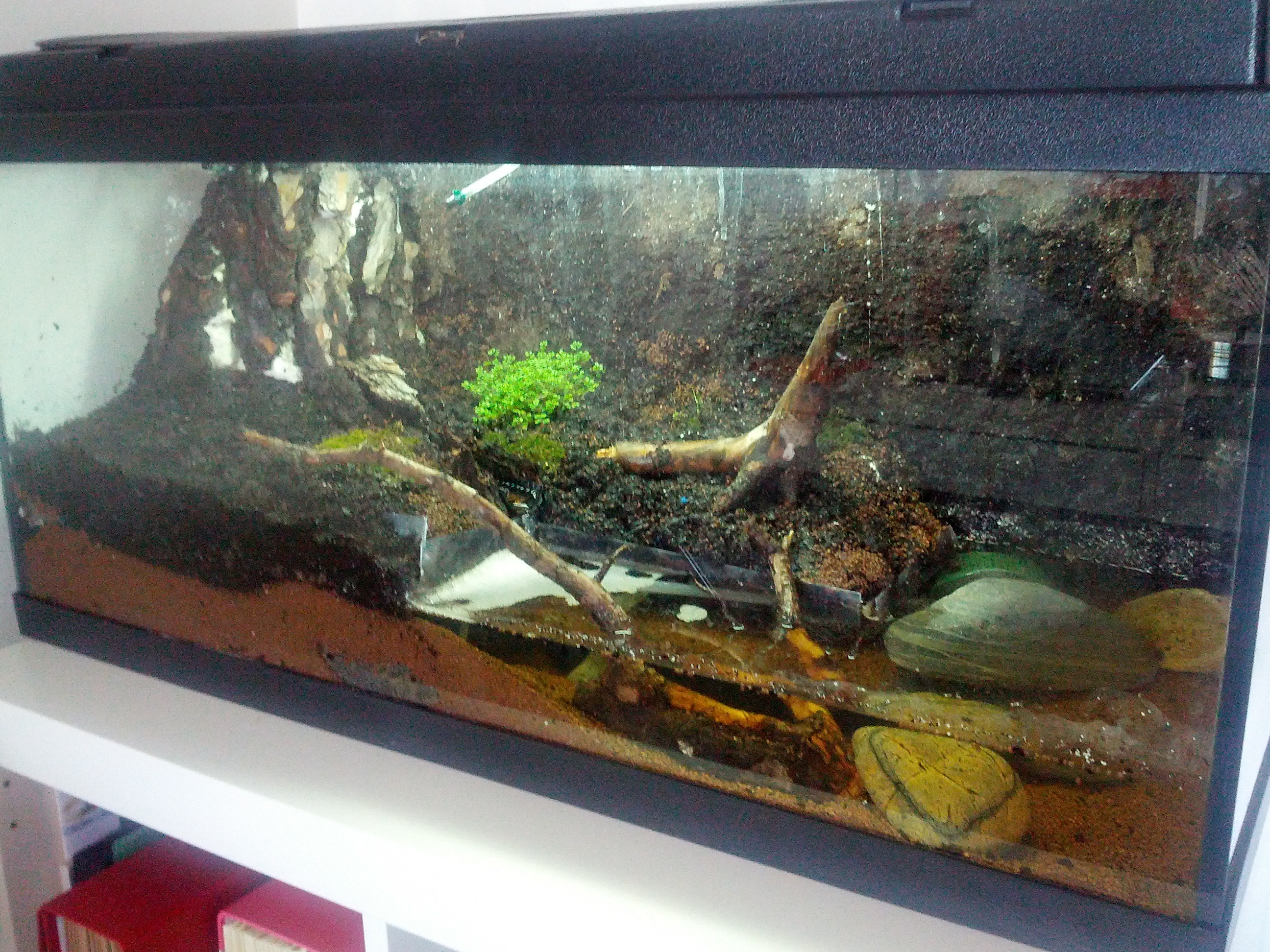 Estoy montando un terrario para un par de azureus en un apecera de 100x40x40, el caso es que deje una zona de agua que utilizo como fuente para la cascada de agua y para la lluvia aprovechando las bombas de la pecera.