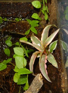 La planta es una Crypthantus como te dijo antes Roberto, puedes plantarla en en un lateral del terrario o en sustrato pero que no tenga las raices siempre mojadas y ya verás como te lo agradece. :)