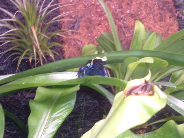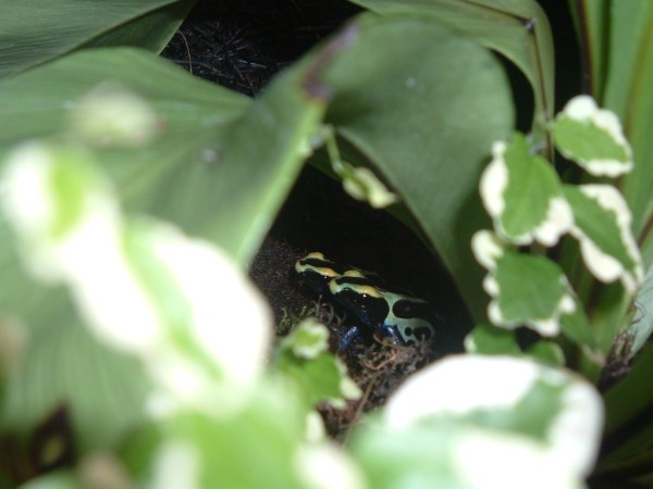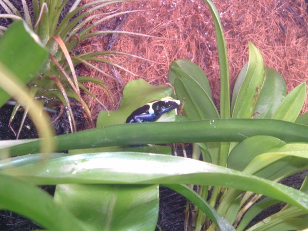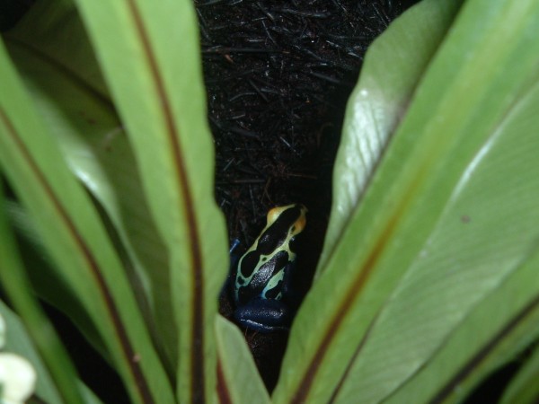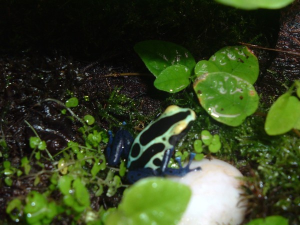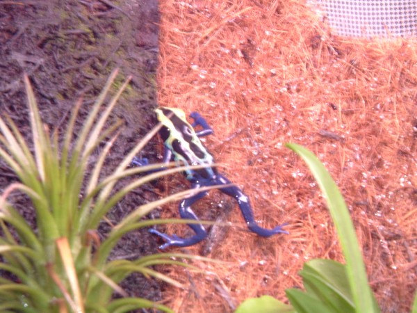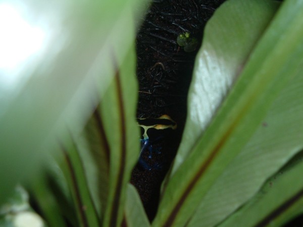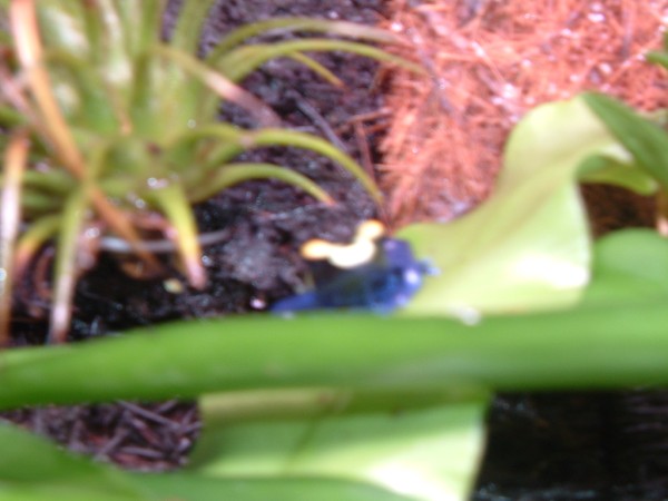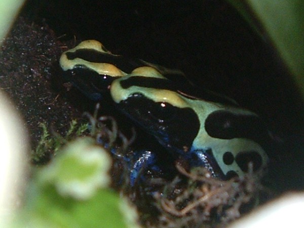 son dos dendrobates tinctorius tafelberg y estan preciosas lo unico que se pasan casi to el rato detras e una planta sobre todo una que casi no sale solo de vez en cuando que se da un paseillo por el terrario y pa dormir que se va a debajo de ficus la otra sale bastante mas