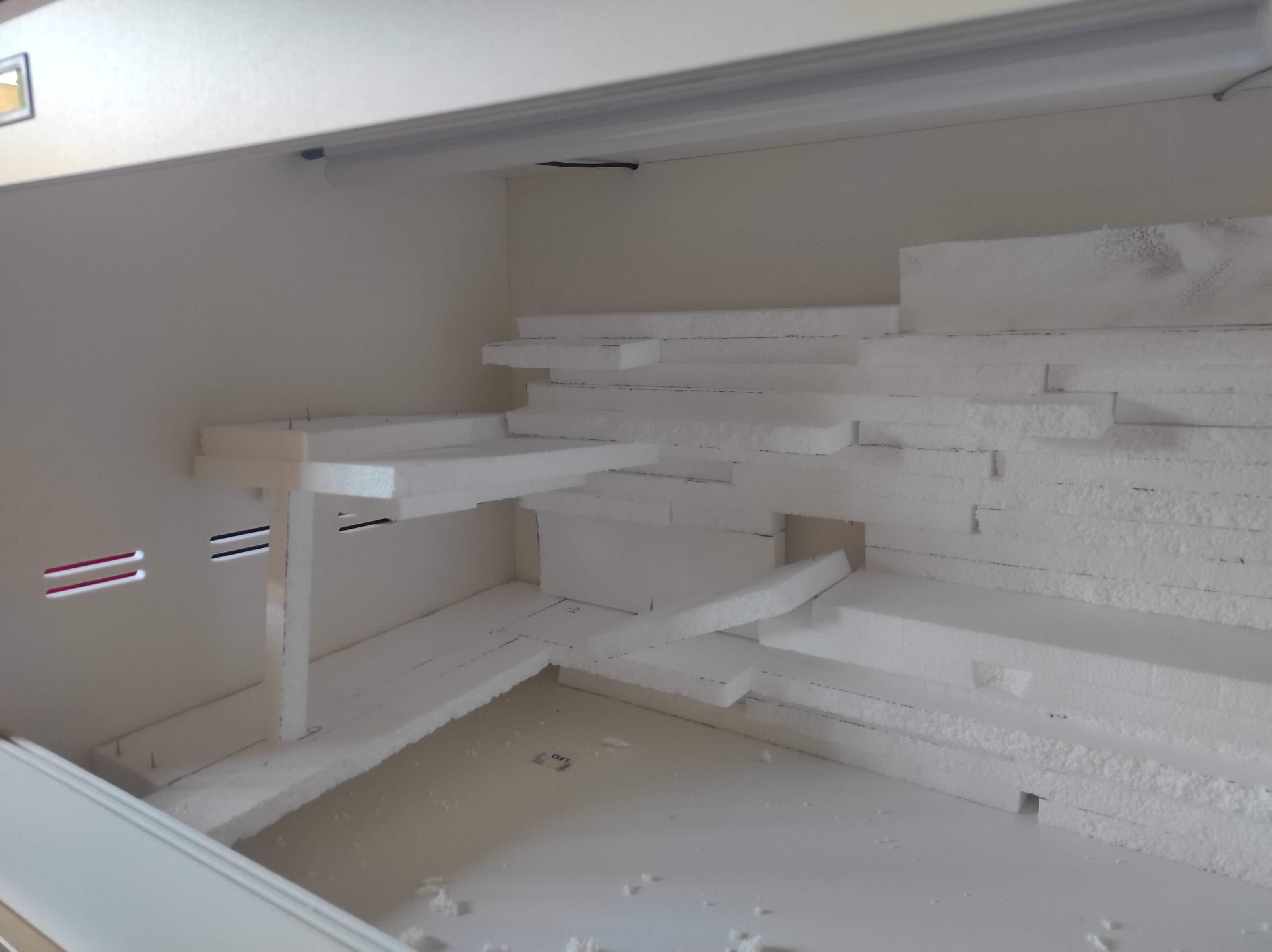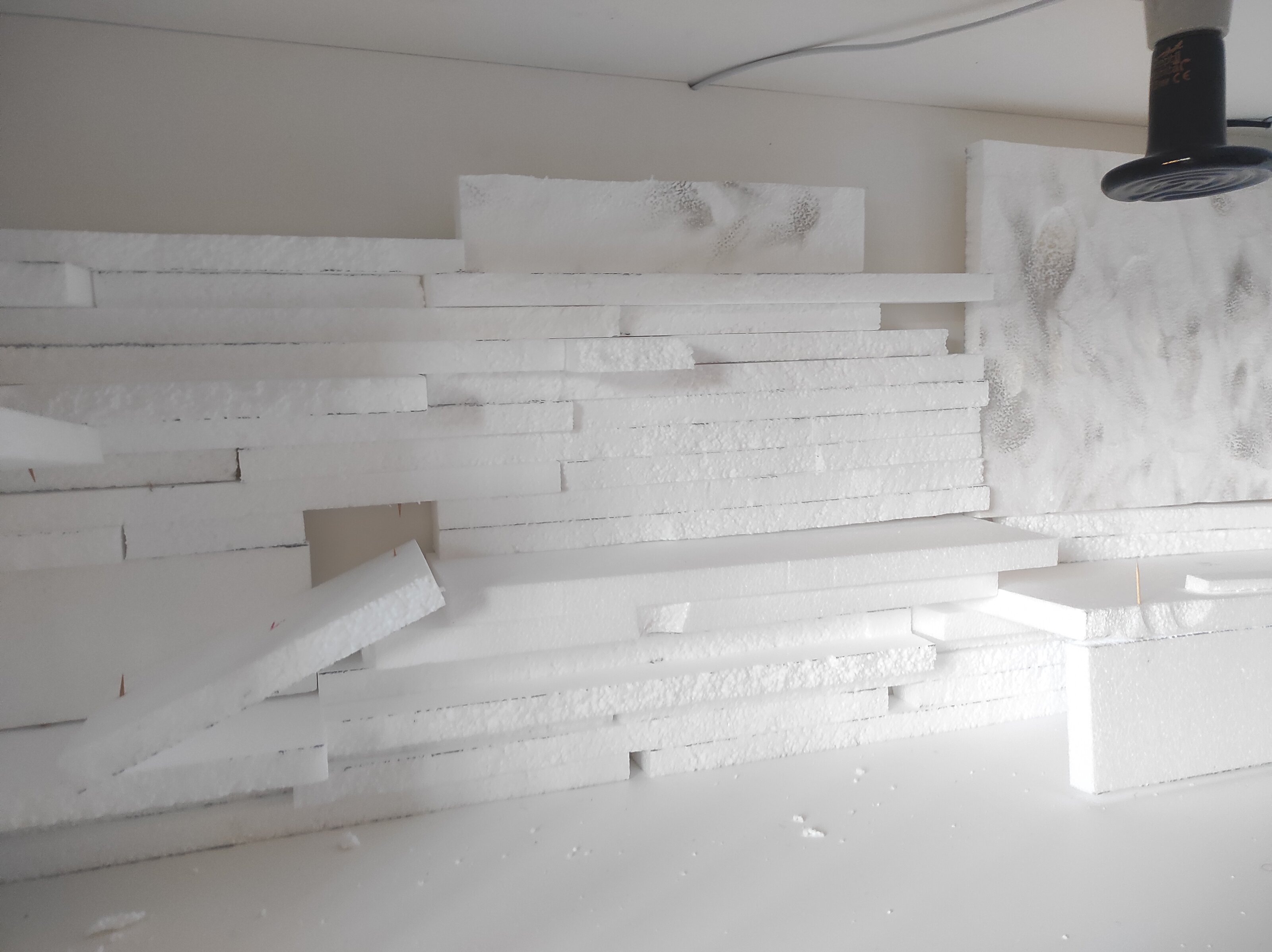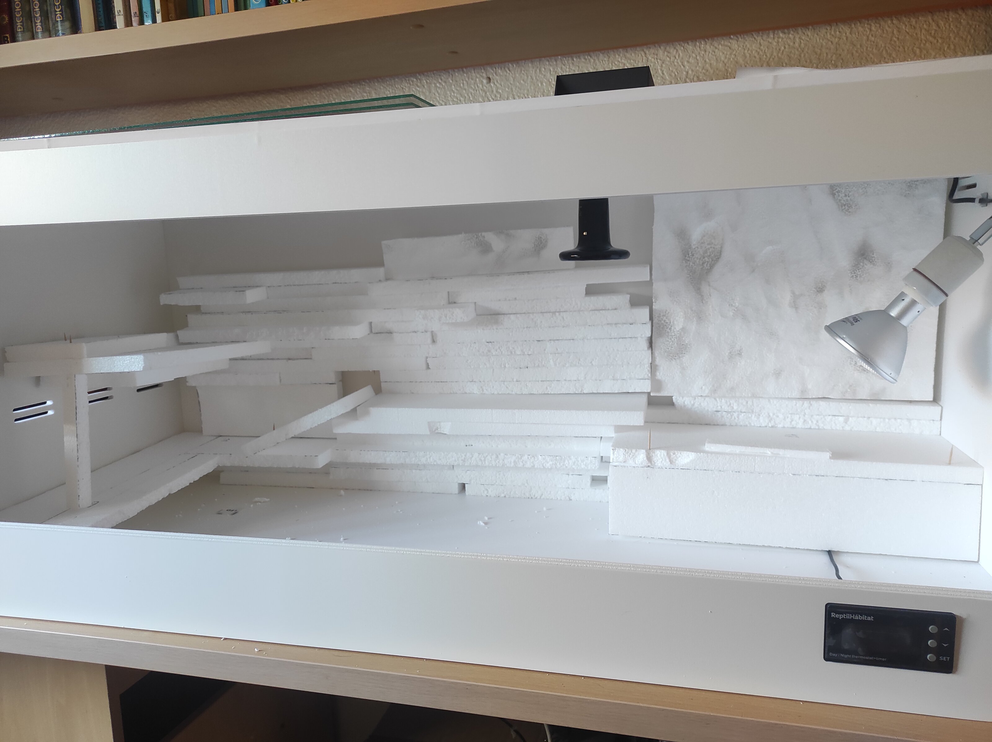 Buenas chic@s, expongo en este post como estoy desarrollando la disposición del fondo del terrario que estoy preparando para una pogona, el terrario de es 120x50x50 y la disposición la expongo en unas cuantas fotos, a grandes rasgos es una cueva en cada zona, caliente y fría siendo la cueva de la zona caliente más cueva y la cueva de la zona fría más soportal, la cueva de la zona fría tiene una zona de asoleamiento(todavía por definir la posición final de la bombilla), y una balda alta en la zona fría, para dar juego a la altura, la disposición de troncos está pensaba para que se llegue tanto a la balda de la izquierda como para asoleamiento a distintas alturas, de momento solamente tengo montado el poliestireno, modificable también acorde a las opiniones que me deis.