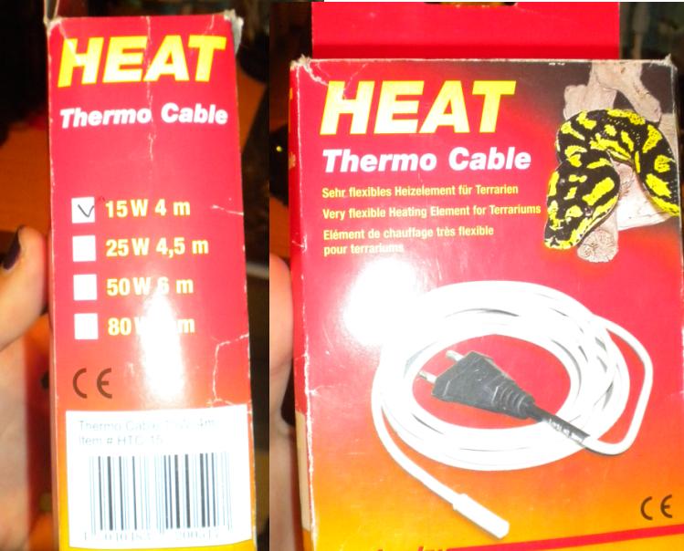 La trasladare en un terrario más grande de cristal y rebuscando encontre que tenia un cable calefactor que le podria poner como me ha dicho Platero a mitad para que vaya a la zona que ella quiera. (He puesto fotos del cable).