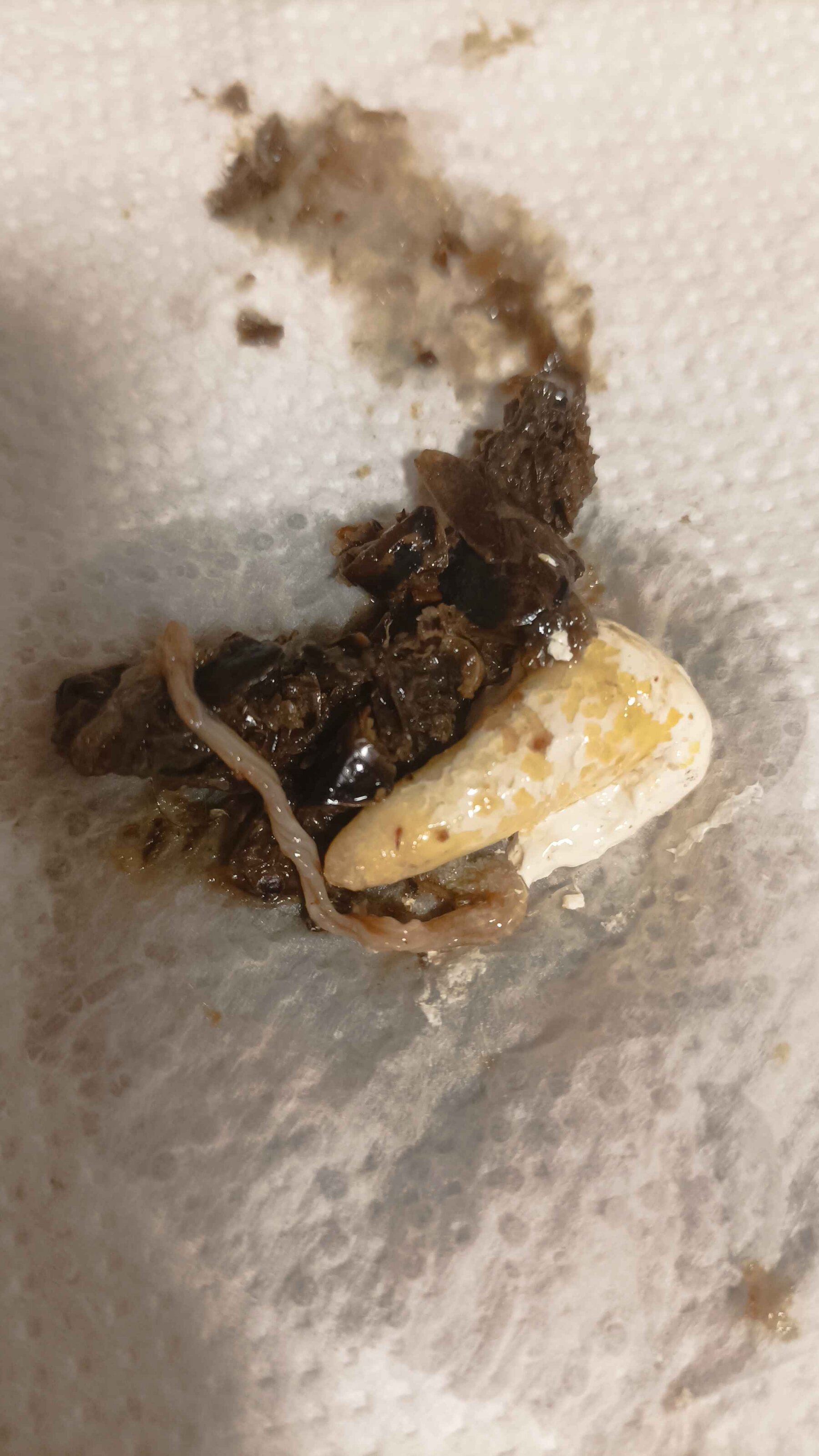 Tengo la foto de la caca que hizo la primera vez, esta en el agua pero por si alguno aqui entiende mucho y de echar un vistazo puede sacar conclusiones la pongo.