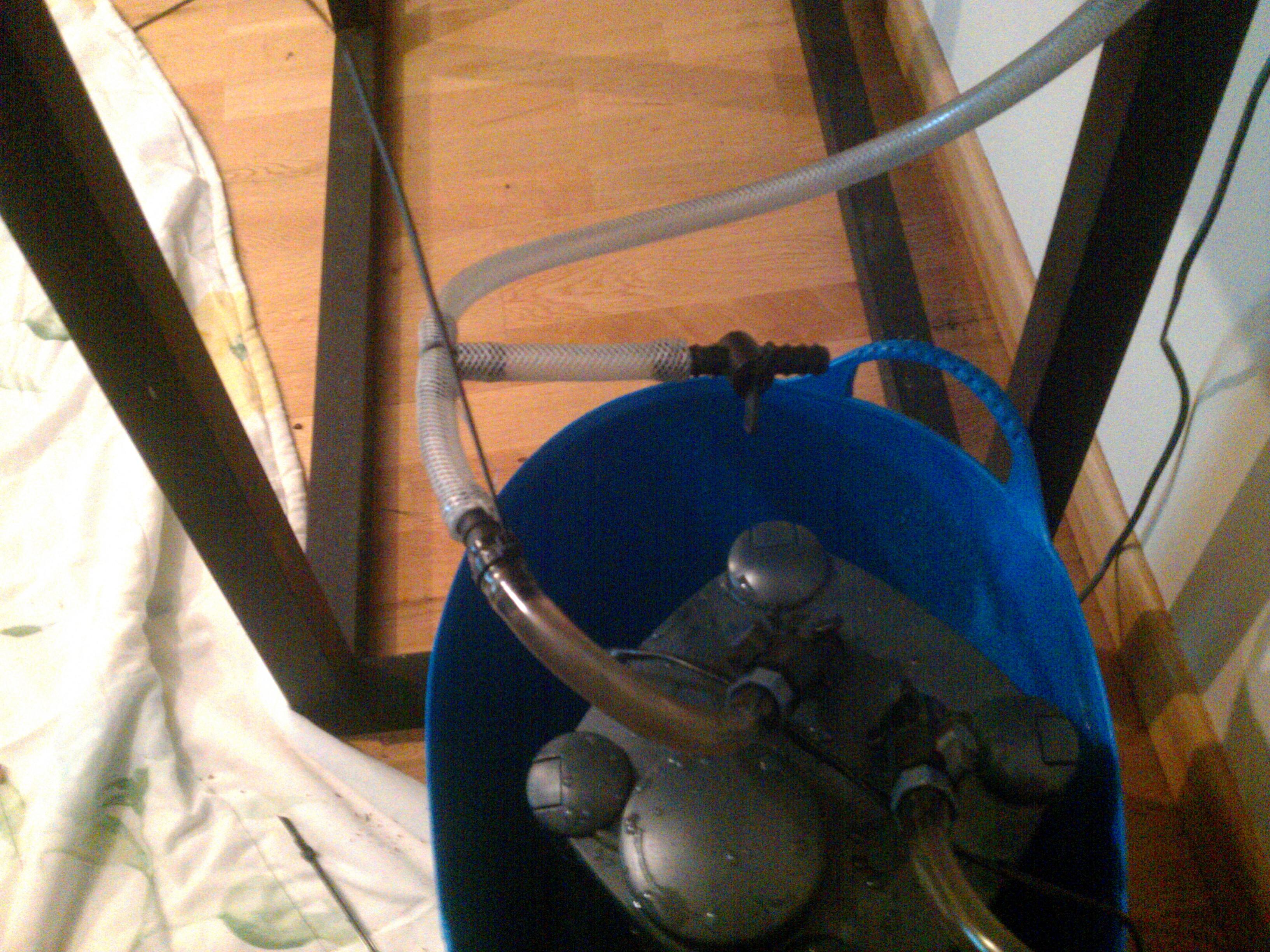 Este es el sistema de cascadas, como os dije uso un filtro exterior, este coge el agua del doble fondo (en el extremo del tubo puse un filtro de inoxidable que compré en una tienda local) y lo lleva hasta la cascada y otro tubo que riega el fondo de hygrolon.