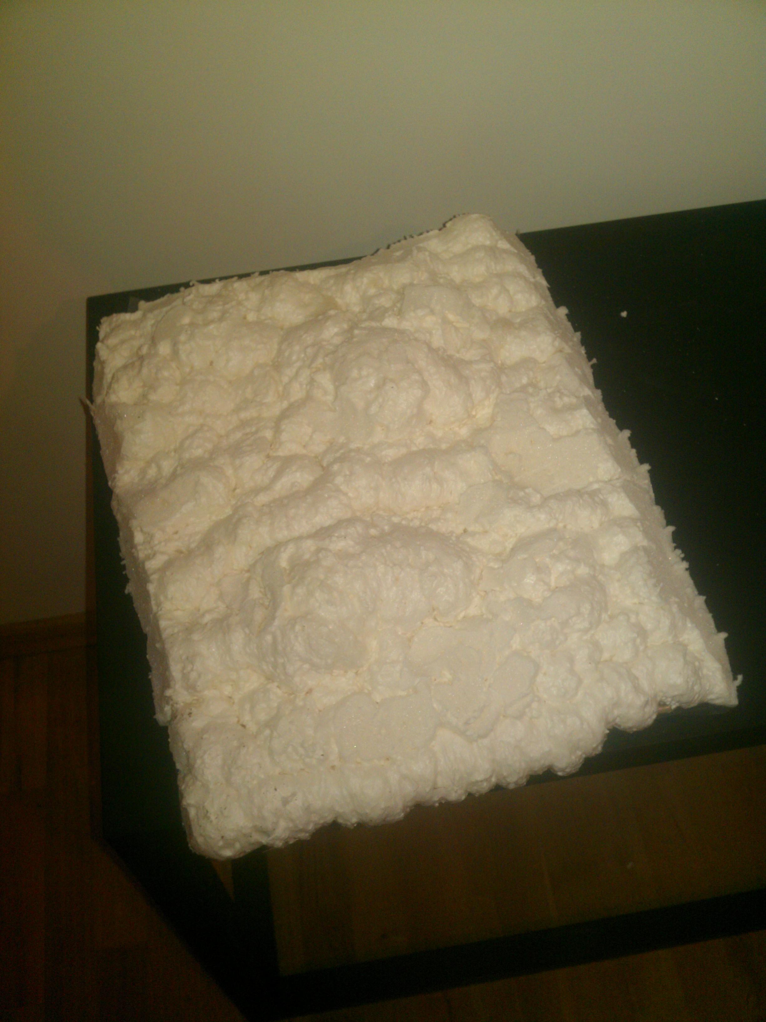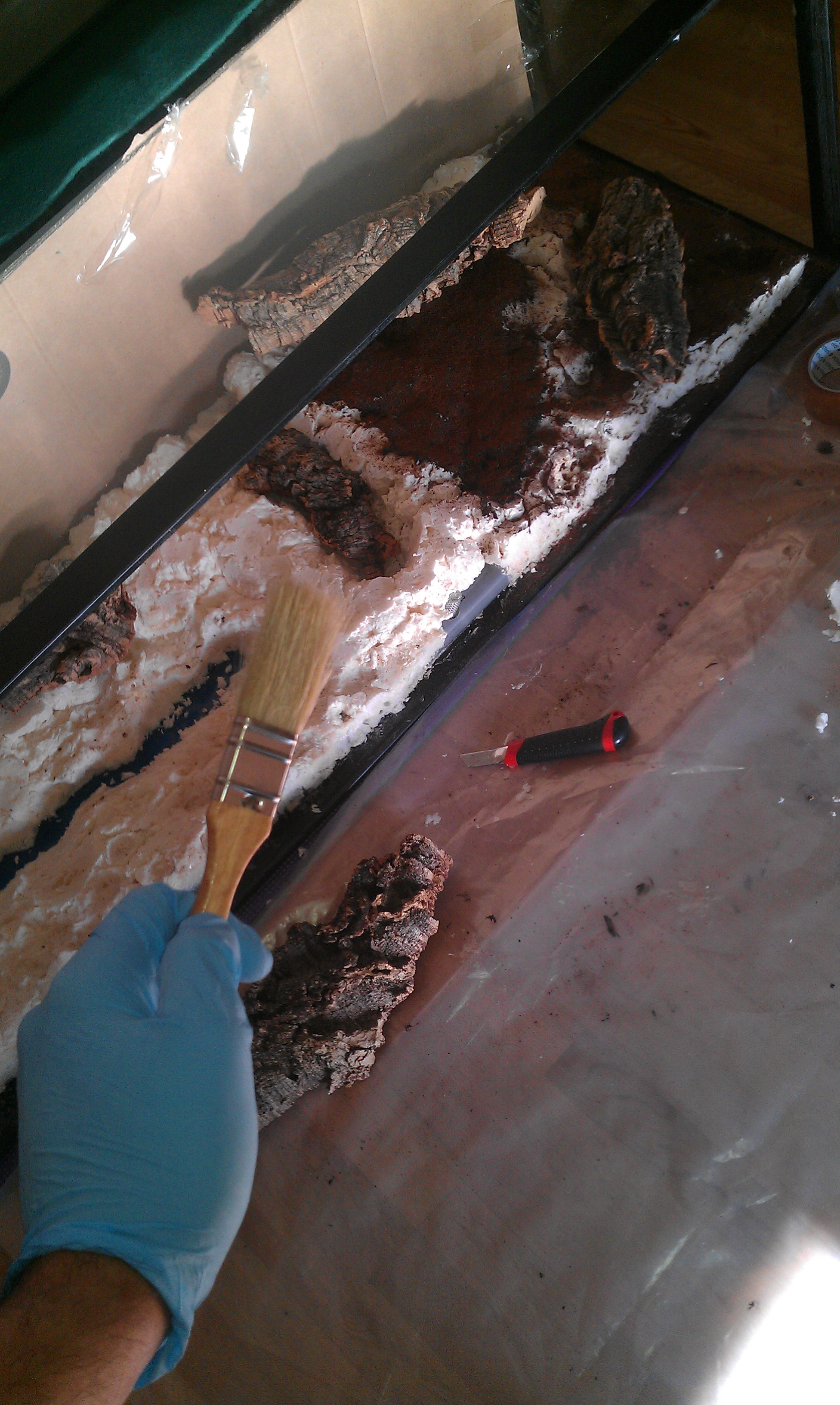 Y aquí imagenes de como hice el fondo de uno de los laterales. Lo que hice fue tomar medidas y cortar un trozo de cartón, a este le puse plástico, y después eché espuma de poliuretano. Cuando secó, corté hygrolon con un poco más de medida y lo pegué a la espuma usando también espuma de poliuretano, lo que hacía era echar un poco de espuma en un recipiente, y estando fresca apliqué sobre la espuma seca una finísima capa, después puse el hygrolon siguiendo las formas y sujetando con alfileres hasta que secó. Aquí podeís ver como quedó, todo esto se pegó a la urna con silicona.