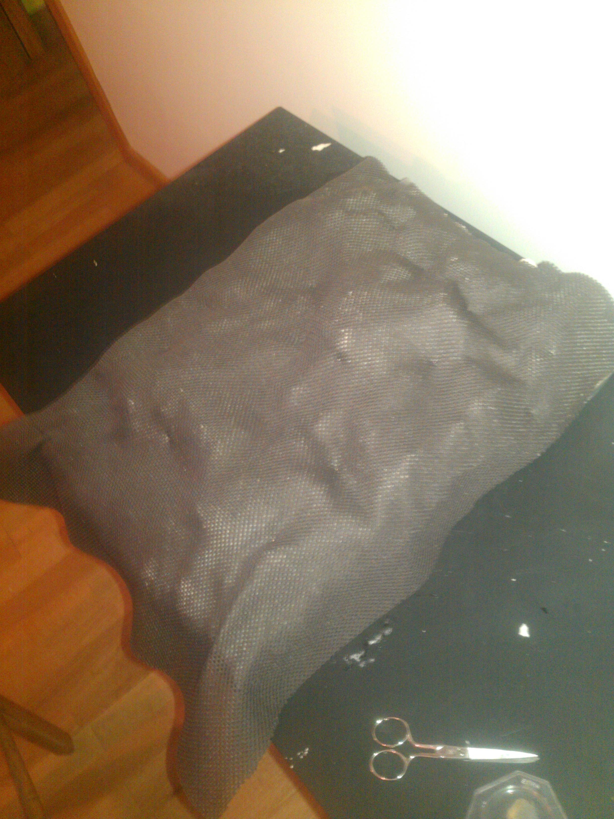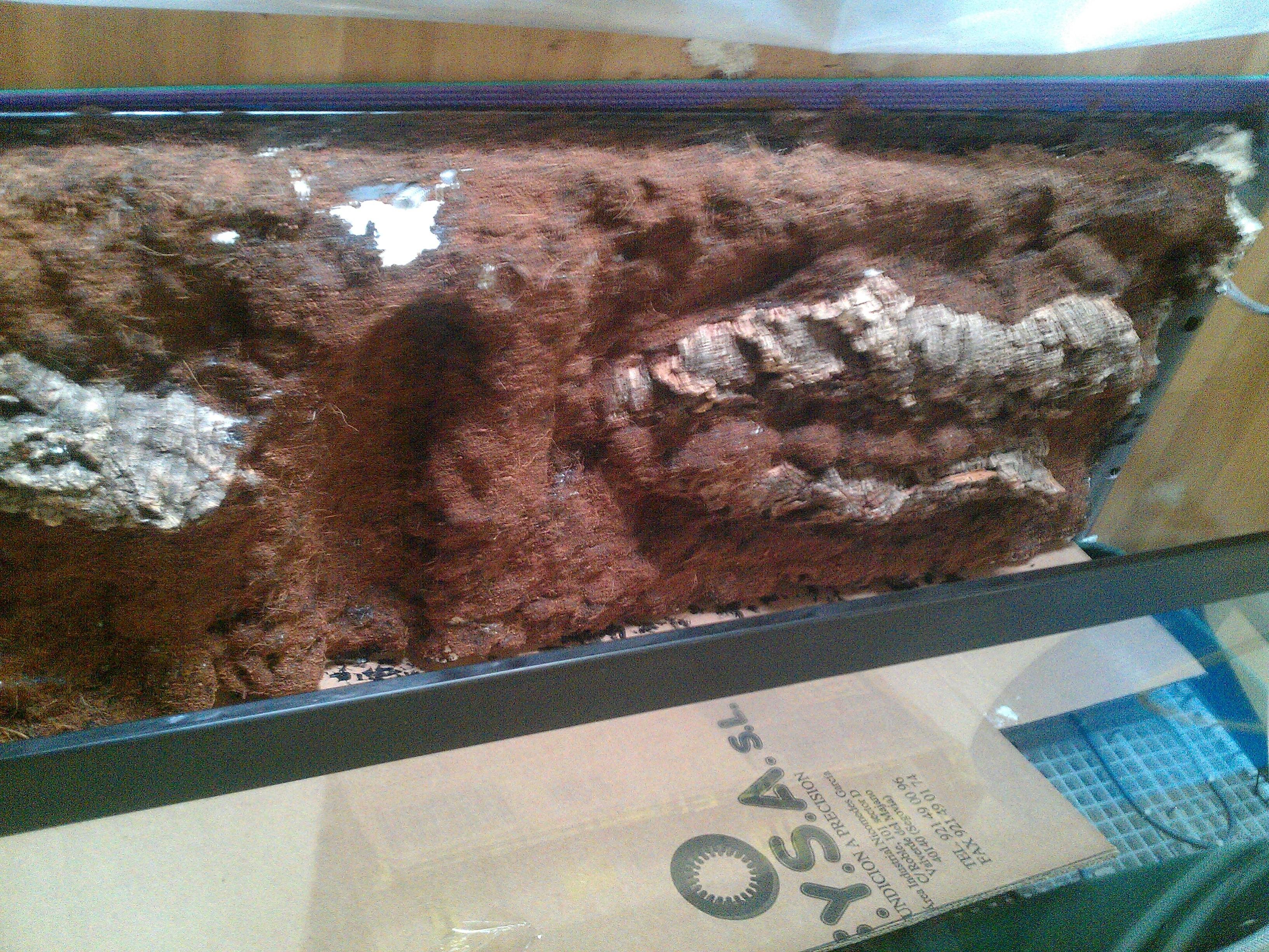 Una vez echada la espuma puse 4 pedazos grandes de corcho y después cubrí todo de silicona negra y fibra de coco, se dice rápido pero he tardado un montón de tiempo jeje.
