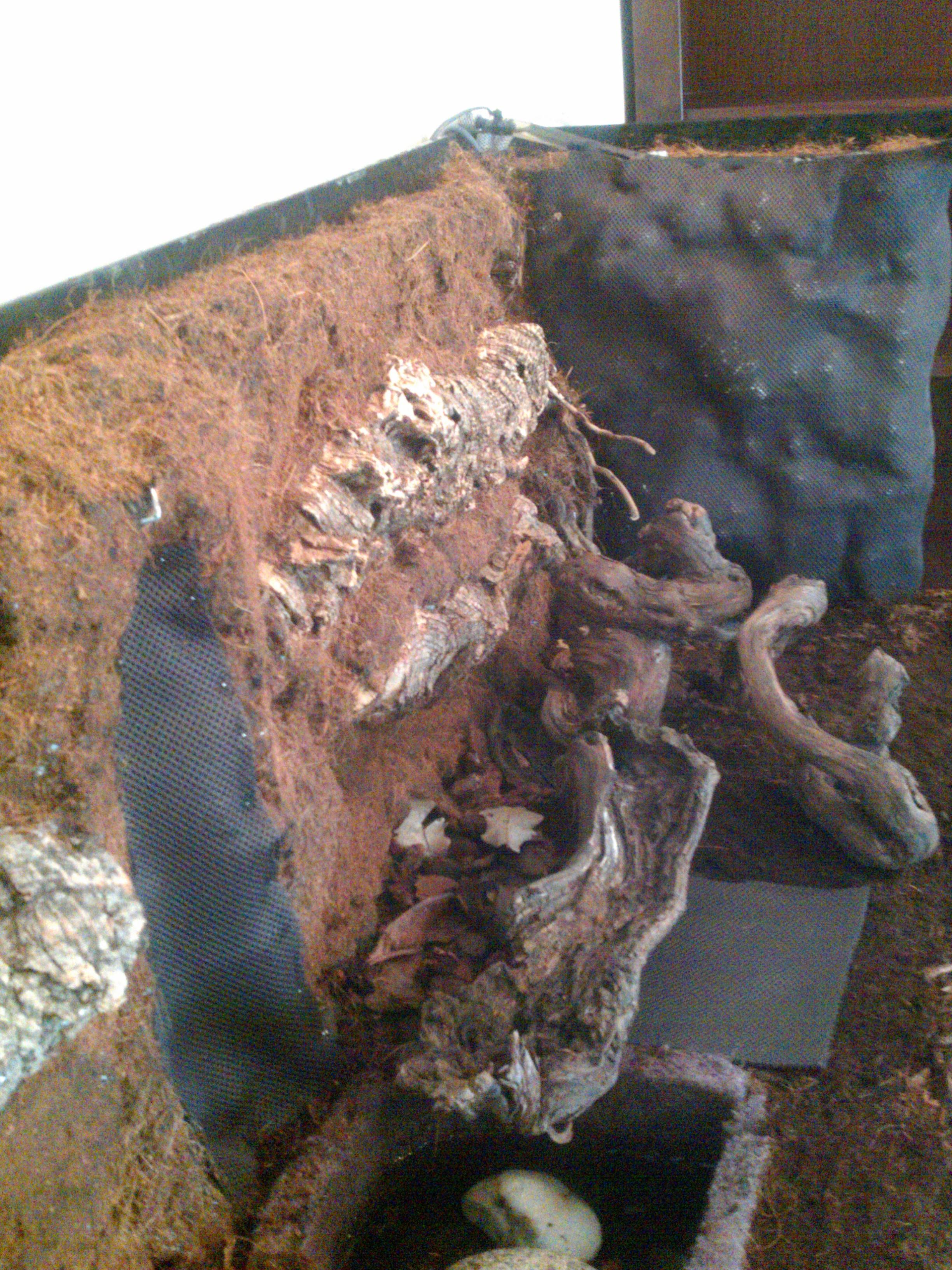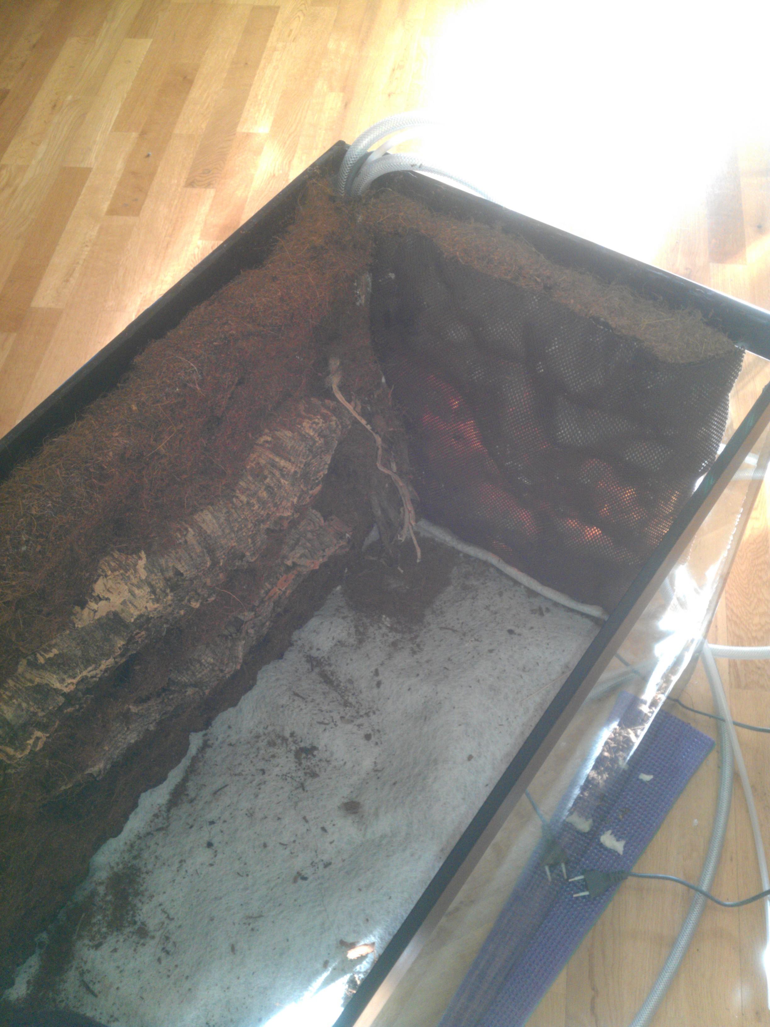 El sustrato que he echado encima del tejido filtrante está compuesto de piedra volcánica pequeña y bien lavada, turba rubia mezclada con fibra de coco, chips de coco, corteza de pino bien lavada y desinfectada y mezcla de hojas (roble, magnolio,etc) estas hojas y los troncos y semillas que voy a echar se las he comprado a un compañero del foro que me las dejo bien baratas y está genial, si os interesa preguntarme y os digo por MP quién es.