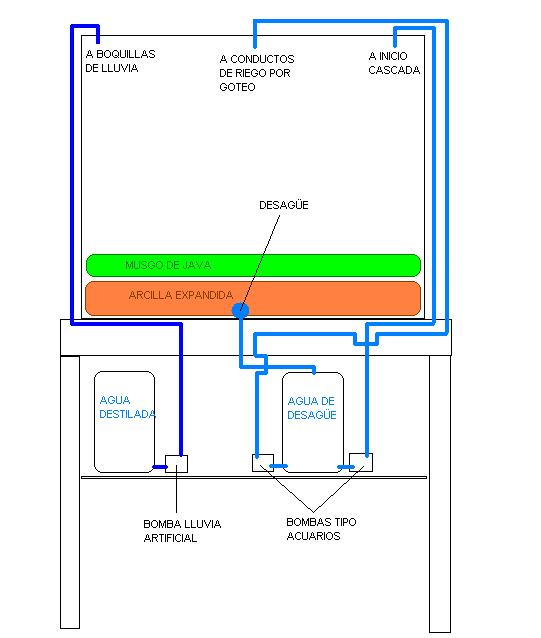 o Sin falso suelo, con sus capas de bolas de arcilla y turba, con un agujerito para el desagüe y sistema de lluvia artificial. Aquí la bomba de la lluvía tendría que estar dentro del armarito en un bote con agua destilas, ¿digo yo?