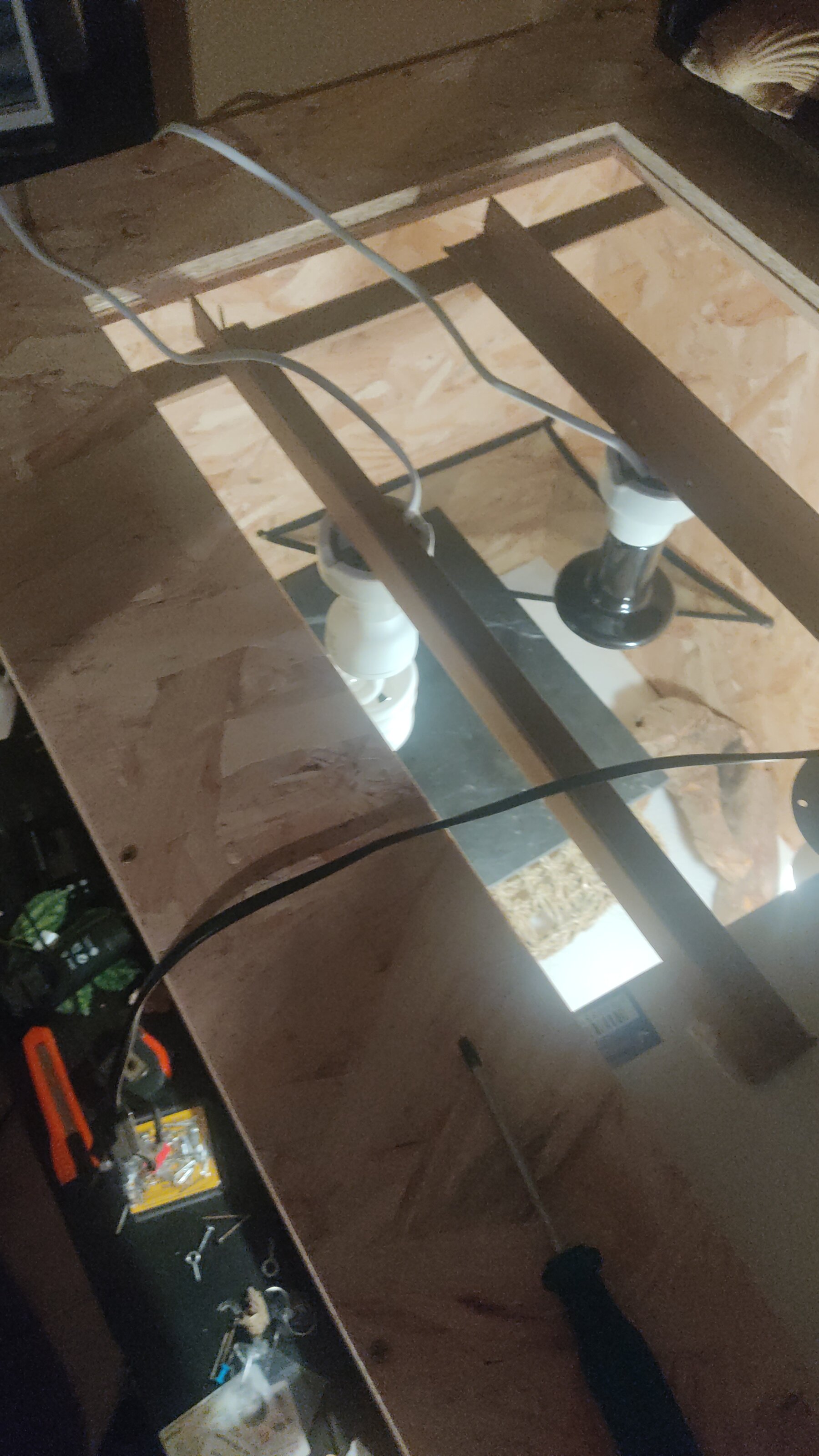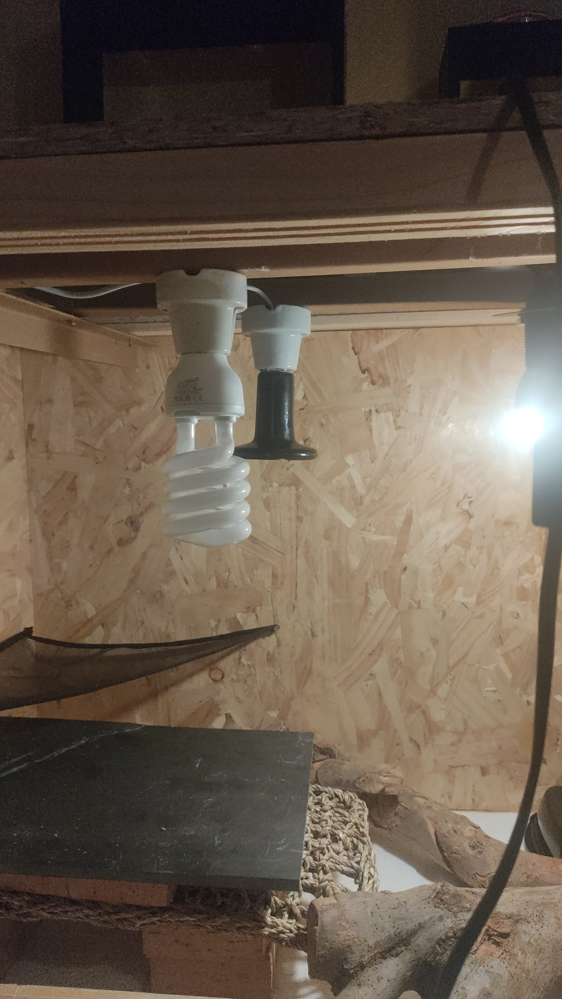 La bombilla de cerámica es de 75w. Pero no alcanza a la temperatura, sube muy poco. La bombilla está a una distancia de 30cm de la zona elevada donde iría la pogona. Puede también por que la mitad del techo del terrario (zona caliente) está abierto. Solo quiero saber qué puede fallar... No me creo que 75w no den suficiente. Adjunto fotos.