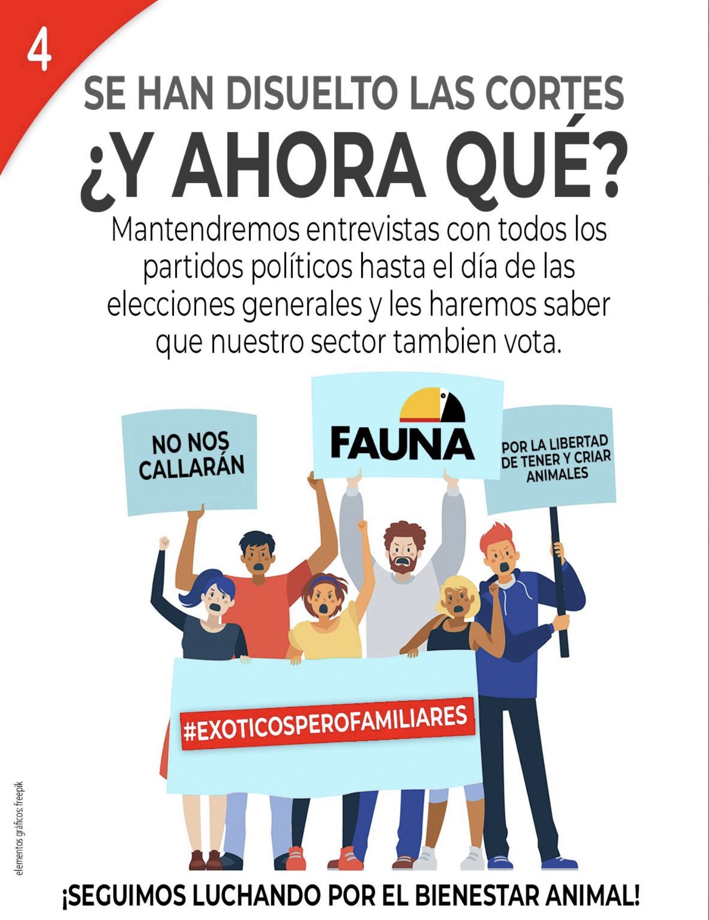 Así mismo, la Federación Fauna ha anunciado una campaña de difusión y de crítica sobre la Ley de Bienestar Animal. Según Fauna explica en su “twitter”, “nuestro sector está profundamente arraigado en la sociedad. No se puede legislar contra acuariófilos, terrariófilos, avicultores y cetreros”. Así mismo, la Federación ha colgado también en “twitter” cuatro “banners” que adjuntamos en este post sobre las actividades previstas como parte de su campaña de concienciación sobre la Ley de Bienestar Animal. A este respecto, la Federación pretende continuar con las reuniones con partidos políticos y ha pedido a Feijóo que devuelva las competencias de CITES a la Secretaría de Estado de Comercio, al tiempo que pide más medios para los profesionales y técnicos del SOIVRE. Fauna quiere que la derogación de la ley esté en los programas de los partidos, por lo que pretende hacer valer las 180.000 firmas recogidas en apenas 2 meses (todo un record) como elemento de presión en las reuniones mantenidas, dado que al disolverse las cortes no puede ser ya presentada una Iniciativa Legislativa Popular. De hecho, parece que sigue abierto el plazo para firmar en contra de la ley y llegar con más firmas a la jornada electoral.
