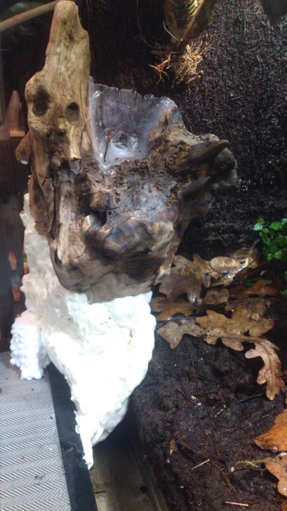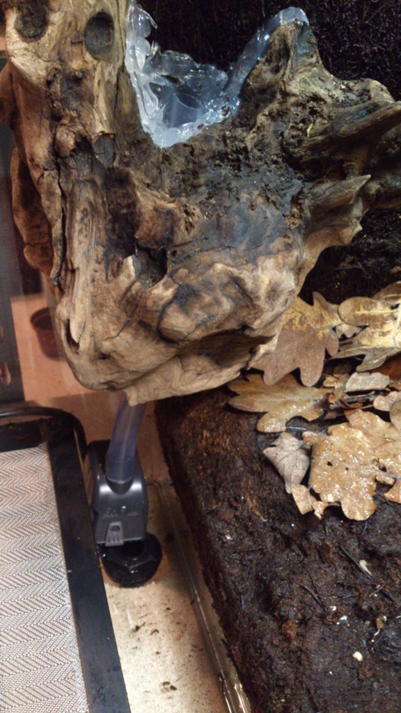 Como he ido comentando anteriormente, he querido realizar una pequeña caida de agua en la parte izquierda del terrario. Para ello he utilizado un trozo de madera de vid, que me pareció muy bonito por sus formas. Además lo vi adecuado, ya que por su parte trasera tenía un hueco por donde poder pasar el tubo de la bomba.