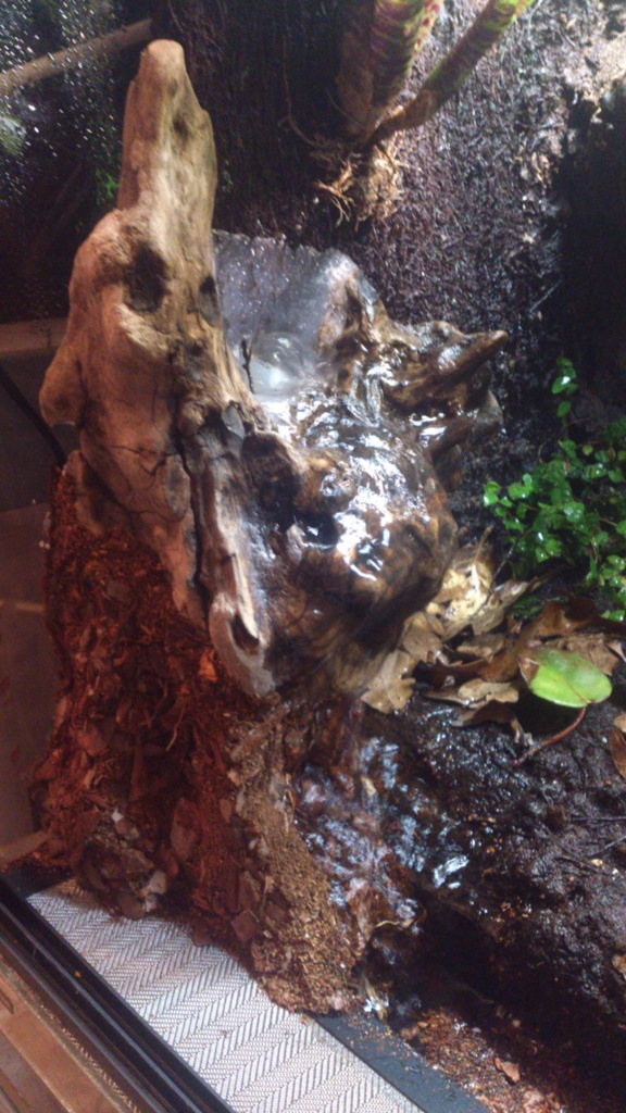 el resultado es éste... el agua doy fe de que cae perfectamente todo hacia la parte acuática del terrario.. la bomba está en la posición de caudal más bajo, para que así no salga con tanta intensidad el agua, ya que tiene poca altura.