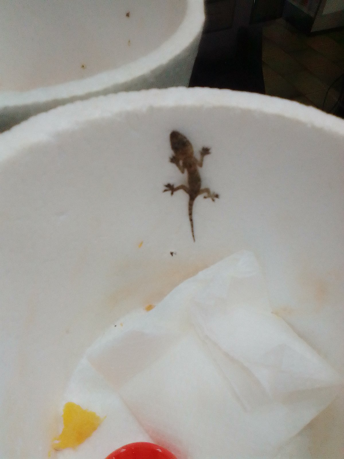 Hola a todos!!!! Me presento, soy Carlos y actualmente vivo en Paraguay y es aquí dónde comienza mi historia. Resulta que encontré moribundo a una Gecko bebé. La coloqué en un recipiente de termopol o duroport. O no se con qué nombre conozcan éste material. El asunto es de que lo quise alimentar con insectos. Le di agua que creo que nunca tomó y pedacitos de naranja. Ésta última si comió poquito. El asunto es que nunca quiso comer insectos y ayer lo encontré muerto. Cosa que me hizo sentir muy mal obviamente pero. No sé a qué atribuir esa muerte. Quizás a las muy bajas temperaturas que hubieron porque aquí en Ciudad del Éste Paraguay. Las temperaturas bajaron estrepitosamente a -2° celsius. Siendo aquí las temperaturas medias entre 23° a 38°. Entonces yo opte por darle calor a lámpara pero no fue posible salvar su vida. A continuación voy a pasar las fotos de éste bello ejemplar de Gecko