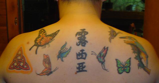 Las letras del tobillo son mi nombre y las de la espalda significan serenidad.