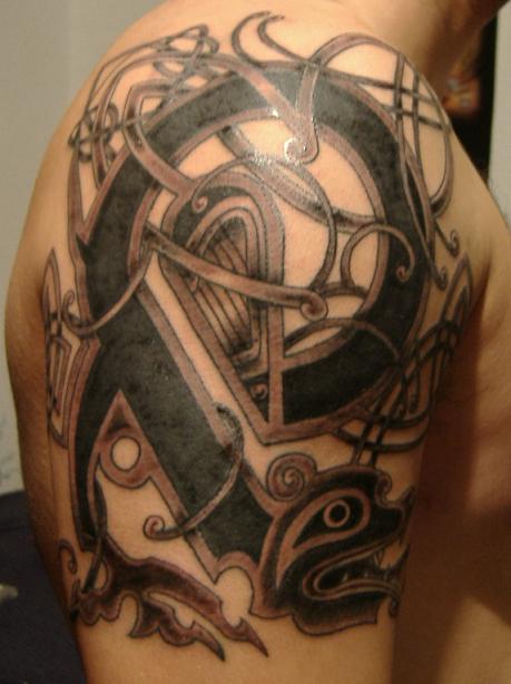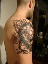 Me lo hice en diciembre. La foto es de la segunda sesión (fueron 3 de 4 horas...) Aun faltaba la parte de dentro del brazo. Una serpiente custodiando un arpa irlandesa, y enfrentada de fauces con un lobo (el lobo está en la parte de dentro del brazo, ya pondré fotillos :D)