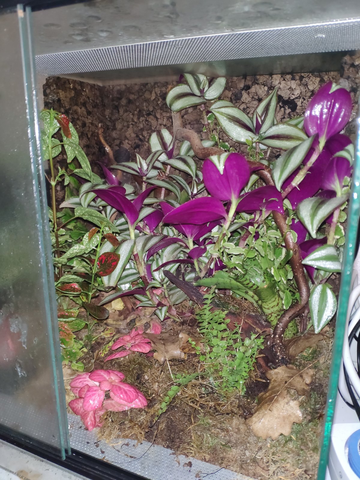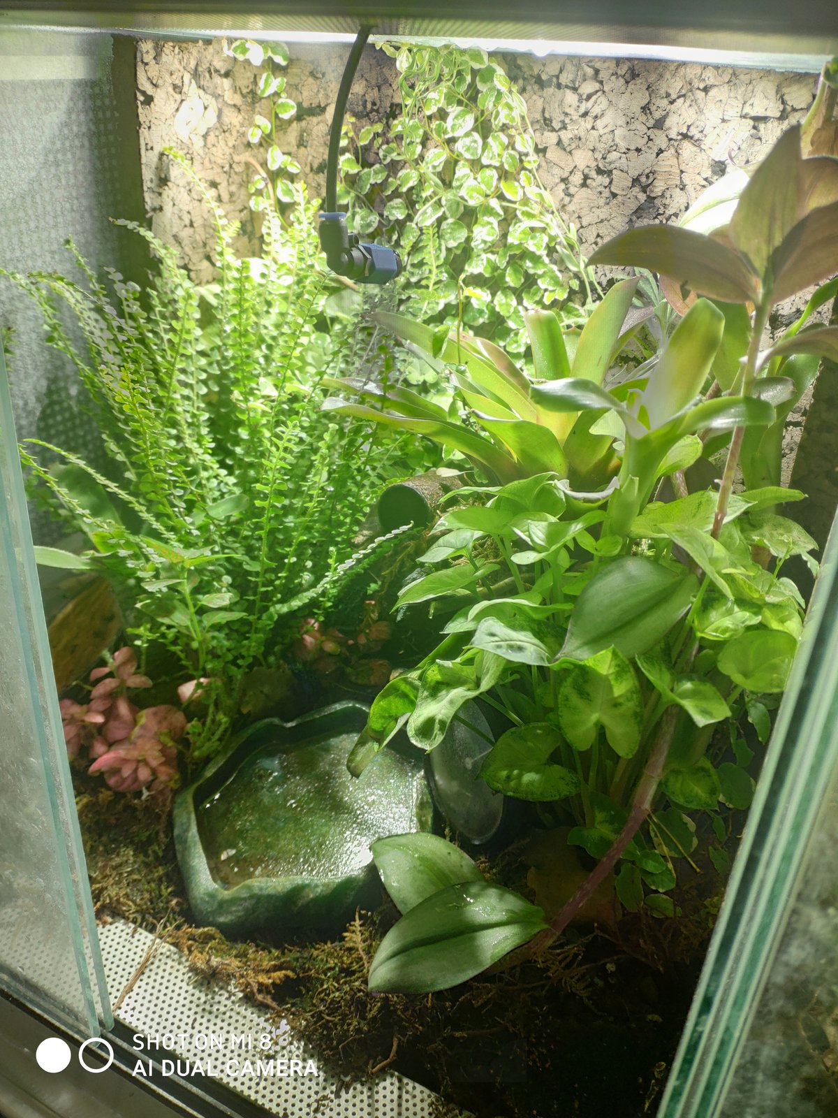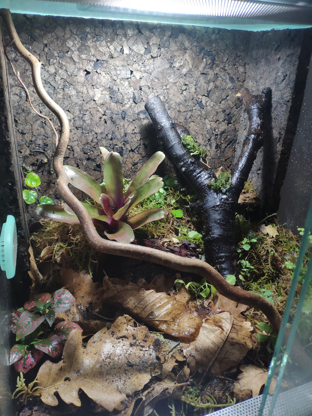 Con respecto al TERRARIO, como has podido ver en mi terra (no se si se ha subido bien) el mío es muy grande, me gusta que los animales estén lo más a gusto posible. Le tienes que poner plantas en todas partes (te faltarían arriba del terra) ya que se mueven por todo el contorno. Ponle algunas neoregelias, tiran muy bien y las puedes poner en las paredes del terra ya que son epífitas.