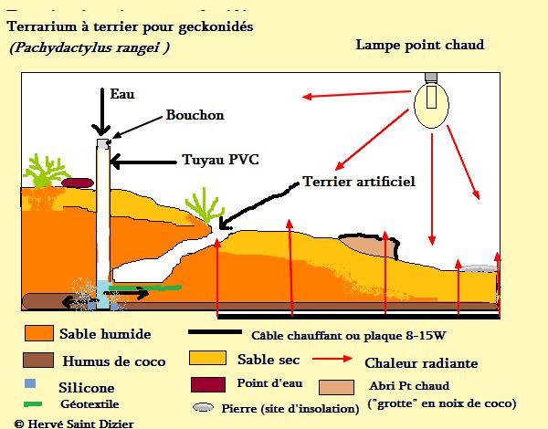 Esto es solo para dar una idea, pero vamos, que tiene muchos fallos... la fibra es una guarrada y se acabará mezclando... además, estos geckos necesitan enterrarse en la arena, por lo que lo removeran bastante... a parte, yo les pondría más sustrato disponible para que "naden" en la arena... el agua encharcará la fibra de coco antes de llegar a humedecer la arena, el agua no vuela... y si sube, sube por capilaridad, pero la fibra de coco tiene muchos poros... a mi no me convence esa estrutura, pero vamos, como decia era para que lo vierais...