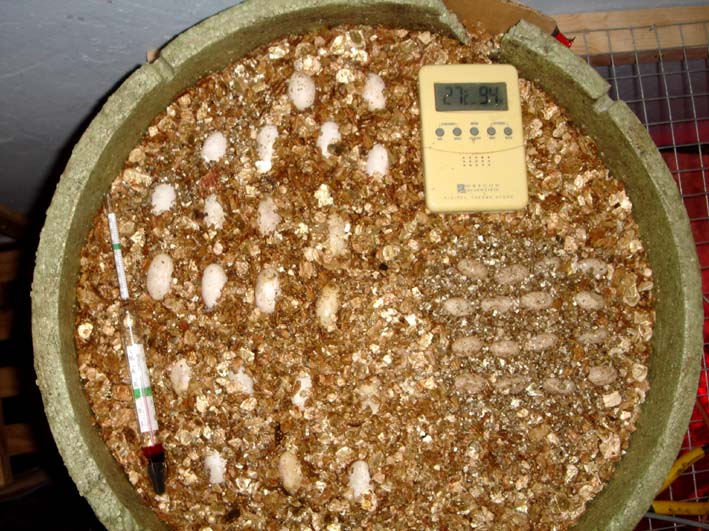 Hola a todos!!!!! Soy papá!!!! jejejeje Aki teneis una fotiko de una de mis nenas poniendo huevos. A continuacion teneis una foto de la puesta y la de la 2ª hembra, Está correctamente la incubadora? he leido por ahi q la humedad deve de ser de entre el 70 y el 80 %, pero mirad a cuanto me sube. La incubadora es Jaeger.