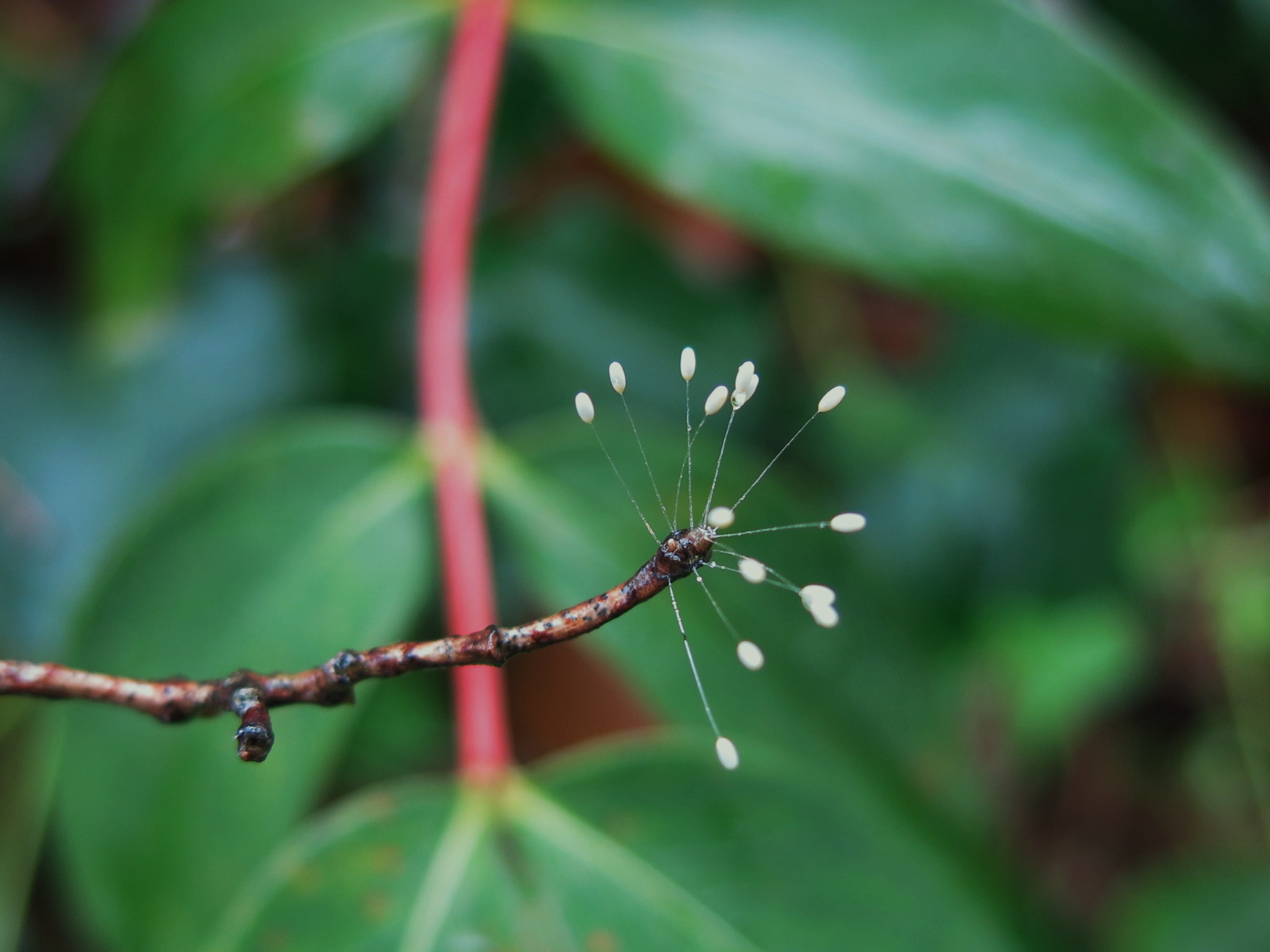 Pues si no estoy equivocado yo diria que efectivamente son huevos de un insecto, ahora no recuerdo exactamente cual. Lo intentare buscar y si lo encuentro lo pongo. Ponen los huevos al extremo de un filamento para evitar que otros animales se los coman o los destrocen. Cuando nacen, las larvas bajan por el filamento hasta el tallo de la planta.