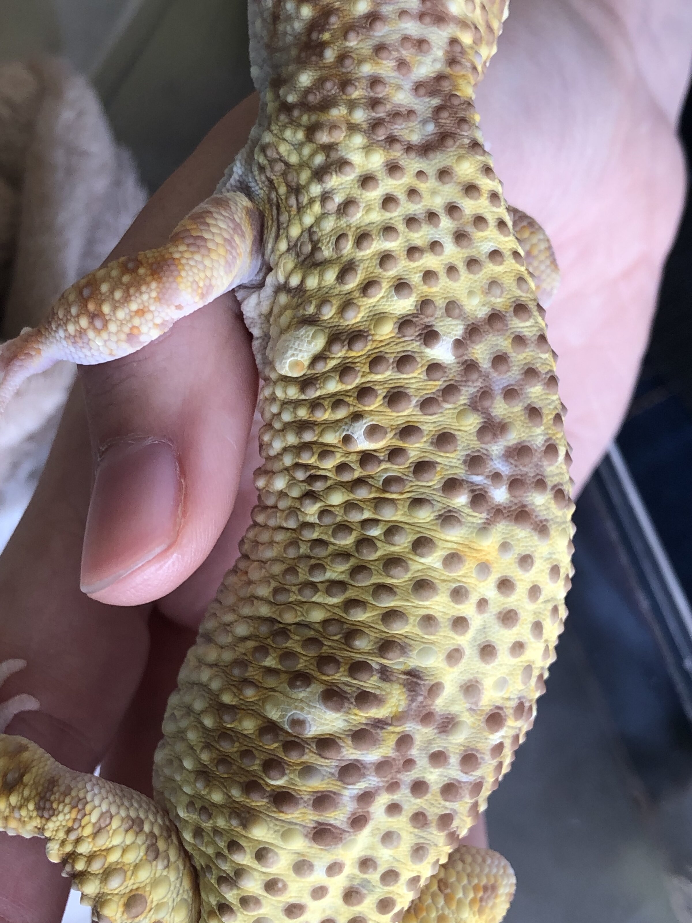 Además, tiene una serie de engrosamientos blancos en el lomo que claramente no son las escamas. La lleve al veterinario y me dijeron que no eran abcesos ni hongos, como si fuera algo normal pero no lo he visto en más geckos sanos.