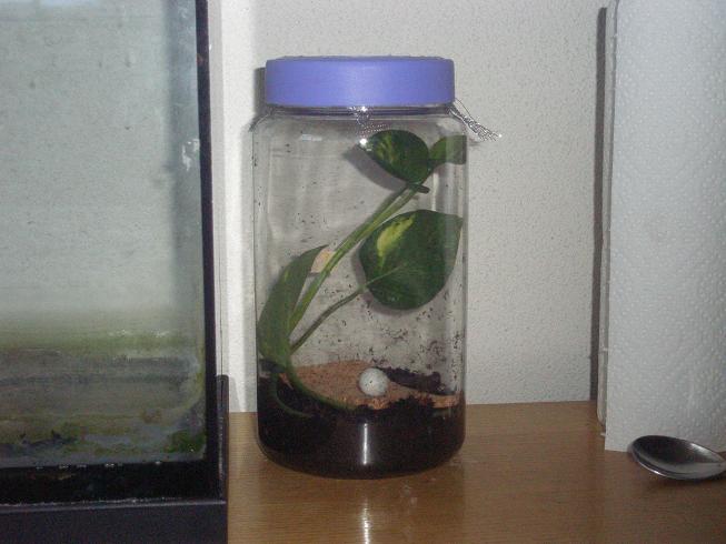 Ademas para mas comodidad a la hora de poner los huevos he introduccido un bambu extra grande en el terrario con un agujero en el compratimento inferior y abierto en el compartimento superior. Ha sido todo un exito porque ya tenemos una bonita puesta en el compartimento superior.