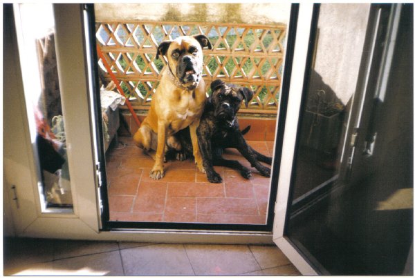 Buenas, yo voy a poner dos que tengo guardadas entre otras muchas de los únicos perros que he tenido. La bullmastiff atigrada se la regalé a una familia y ahora vive con otros perros y caballos en una pedazo de torre ya que me tuve que mudar a un piso y estaba acostumbrada a jardín y se comía la madera, puertas,mesas,etc. Y el macho bóxer que se había criado en piso y lo tenía desde los dos meses se vino conmigo y vivió 3 años más, al final lo tuve que sacrificar con 11 y medio por que ya tenía problemas graves. Después de esto decidí que no más perros porque estos fueron irrepetibles y creo que otros me decepcionarían además de que ahora soy camionera y ya no tengo tiempo.