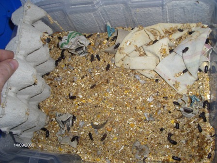 Lo que hago con el sustrato: Tengo los adultos por separado, los dejo una temporada para que pongan (en el sustrato de harina y toda la pesca), al cabo de un tiempo, y cuando veo que ya hay muchos gusanos pequeños, se lo cambio. El sustrato donde están las larvas lo dejo hasta que se hacen gorditas y se lo han comido casi todo. Entonces  se lo cambio o le añado más.