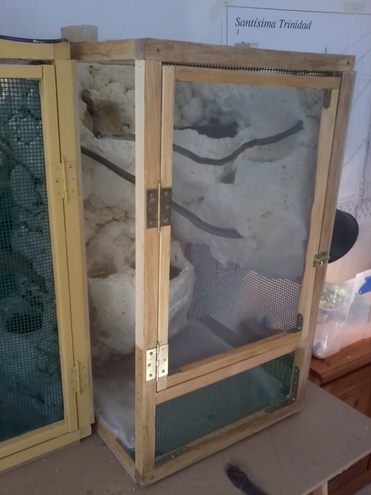 Bueno pongo otra fotillo mas, viendo terrarios me he dado cuenta que una buena opción para la puerta, es poner rejilla muy pequeña de mosquitera de fibra de vidrio y para el resto algo mas grande de plastico para que pueda trepar,cambiaré tambien la puerta del otro terrario, ya que se ve muchisimo mejor, y ya que lo "tuneo" que por lo menos se vea! jeje...soy algo pesadillo pero me puede la emoción.