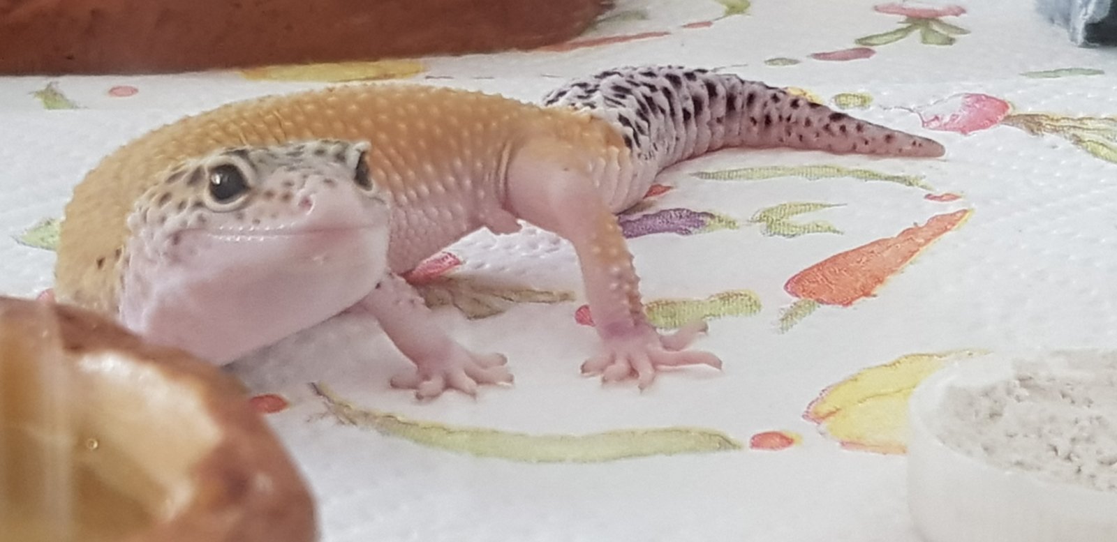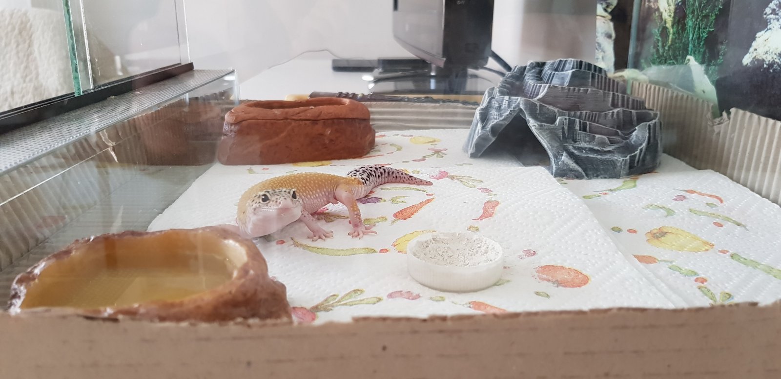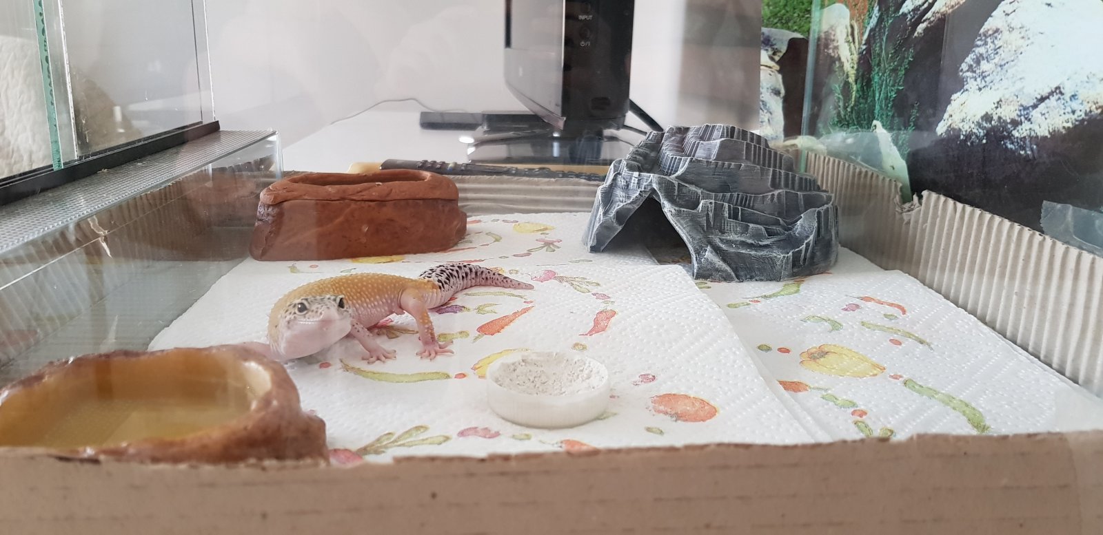 Buenos, me compre esta bichilla y me la dieron ayer. Soy nuevo en geckos y tengo muchas ganas, pero estoy un poco preocupado porque no tiene apetito ni he visto heces en el terrario. Está en un terrario 40(largo)x40(ancho)x30(alto). Tiene un taponcito con calcio y vitamina D3 del que le he visto comer,( no sé si tendrá descalcificación...), también tiene un comedero con tenebrios (he puesto pocos para ver si come), un bebedero y una cueva en la zona caliente. He puesto papel de cocina como sustrato hasta que decida qué poner o si dejarlo así. He visto que tiene algo en la pata izquierda, me dijeron que era una hembra...(no sé si será un hemipene, una bolsa de grasa...) opiniones por favor
