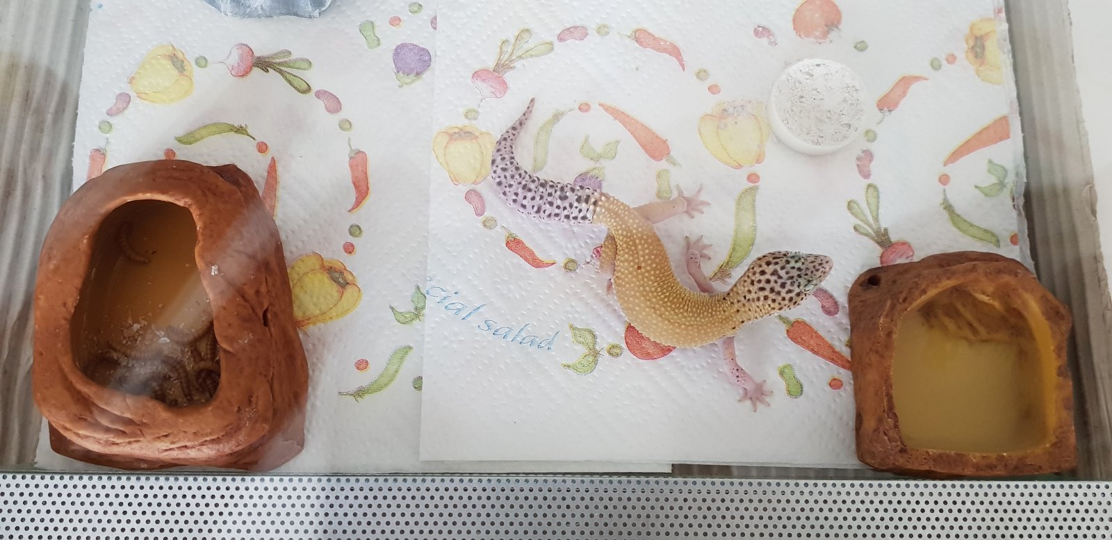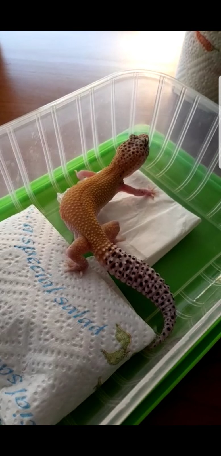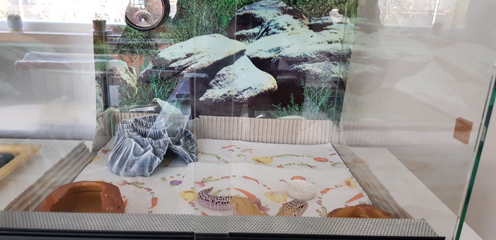 Buenos, me compre esta bichilla y me la dieron ayer. Soy nuevo en geckos y tengo muchas ganas, pero estoy un poco preocupado porque no tiene apetito ni he visto heces en el terrario. Está en un terrario 40(largo)x40(ancho)x30(alto). Tiene un taponcito con calcio y vitamina D3 del que le he visto comer,( no sé si tendrá descalcificación...), también tiene un comedero con tenebrios (he puesto pocos para ver si come), un bebedero y una cueva en la zona caliente. He puesto papel de cocina como sustrato hasta que decida qué poner o si dejarlo así. He visto que tiene algo en la pata izquierda, me dijeron que era una hembra...(no sé si será un hemipene, una bolsa de grasa...) opiniones por favor