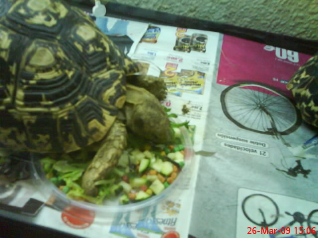Llevaba barios días dándole de comer pienso mojado en suero con una jeringuilla, y ella no sacaba la cabeza del caparazón y no abría los ojos, y hoy de buenas a primeras me la encontré como quien sale a tomar el sol, con el cuello apenas estirado, pero con los ojos abiertos y le he puesto un poco de calabacin y pepino cortado en daditos con unas hojitas de canónigos y rucula y empezó a comer sola, tengo un subidon que no puedo ni explicarlo.