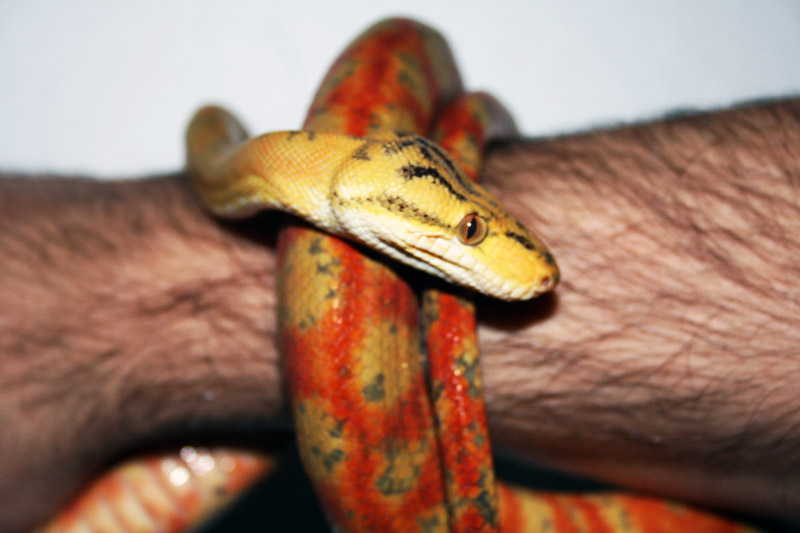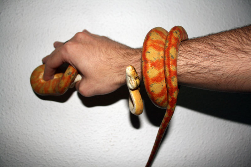 he probado a provocarlo bastante , me he llevado un mordisco , y realmente no apreto mucho , lo justo para hacerte sangrar y no mas , los dientes son alfileres , aun asi , hay que mosquearla muuuucho para que se lance , la puedes incluso tocar suavemente que no se llega a tirar simplemente te mira con el cuello en S , pero ahy queda la cosa.....
