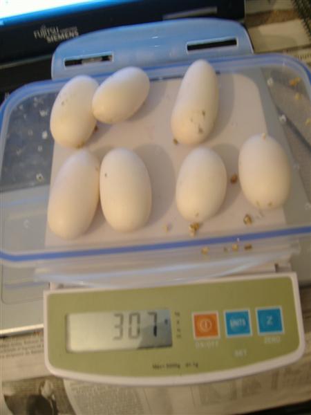 Finalmente sobre las 13:30 terminó la puesta completa. 7 huevos bien hermosos, que han pesado un total de 307 gramos, y que ya están incubándose a temperatura adecuada.