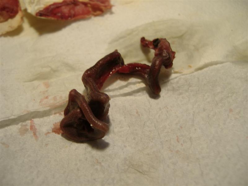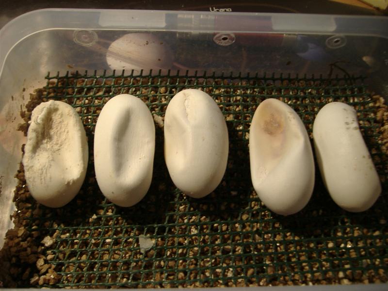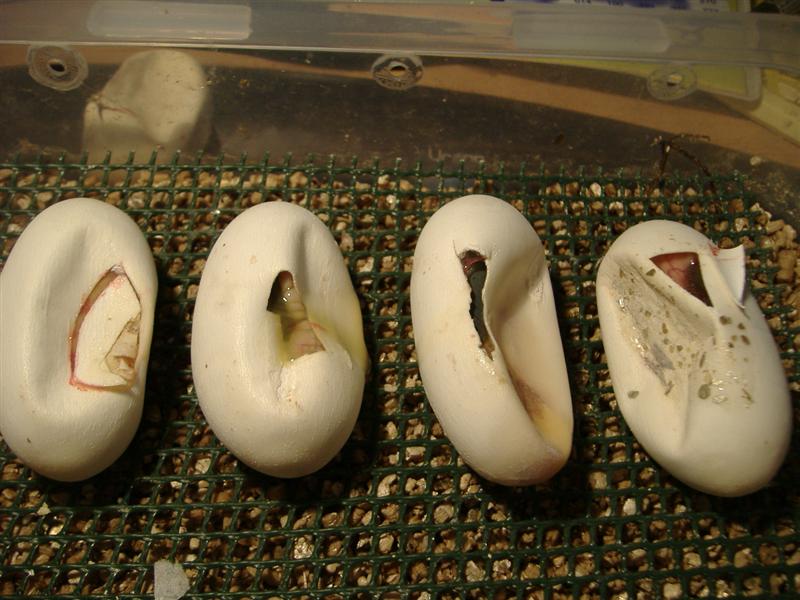 He llegado a casa tras 4 días de ausencia, y he visto que uno de los huevos tenía moho, así que ya que esperaba su eclosión entre los 100 y los 120 días he decidido abrirlos para saber si todo marcha bien.