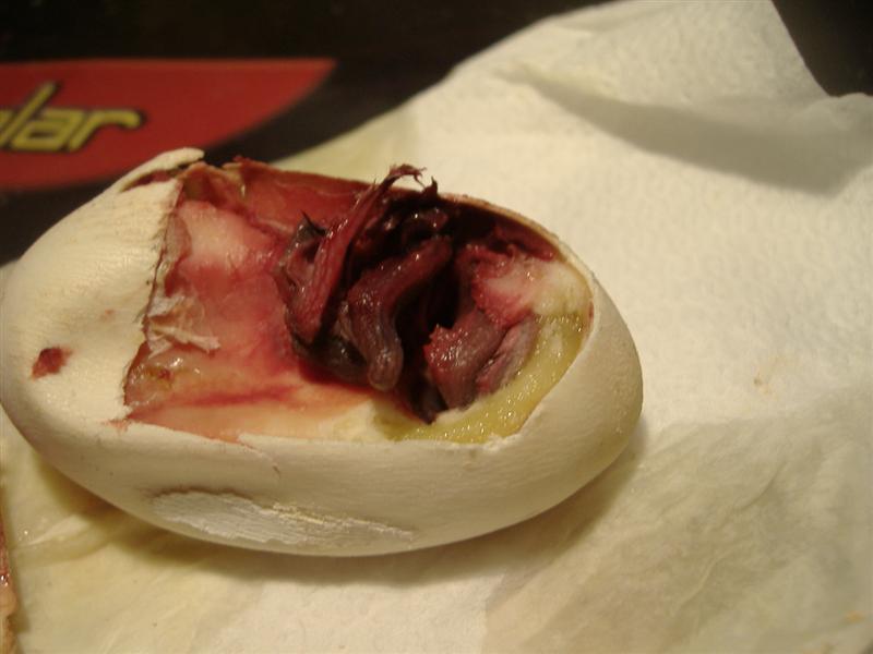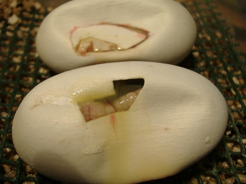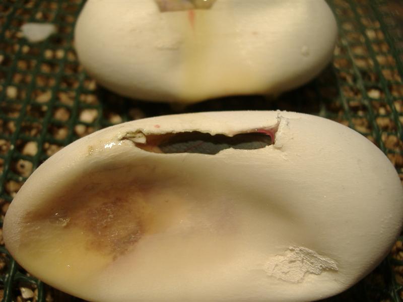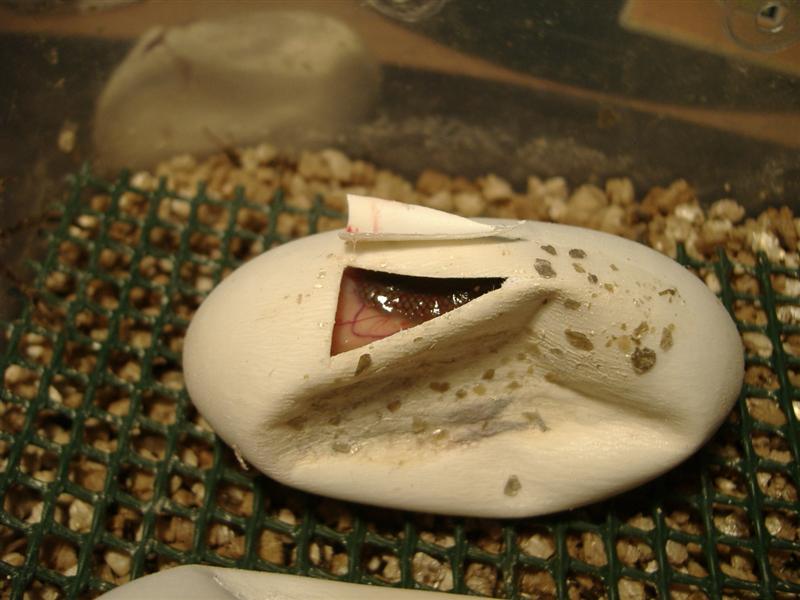 Lo que me animó a abrir los huevos fue el ver uno de ellos en mal estado, cuando estaba aparentemente bien días antes, por lo que me hizo pensar que podría haber muerto al intentar nacer, y no quise arriesgar el resto de la puesta.