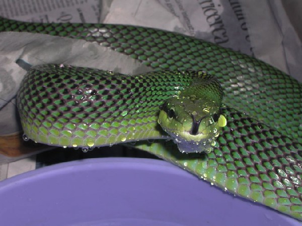 Come dice Nazza uno de los principales problemas que tienen estas serpientes es la deshidratación (Nazza ya sabes algo más de español ;)), esto es debido a que la mayoria de ellas no saben beber de el bebedero sino que lo hacen de las gotas de agua que hay en las plantas (como los camaleones), por esto los exportadores las mantienen en cubetas llenas de agua para evitar que se deshidraten lo que les provoca otro de los problemas tipicos que son las infecciones cutaneas.