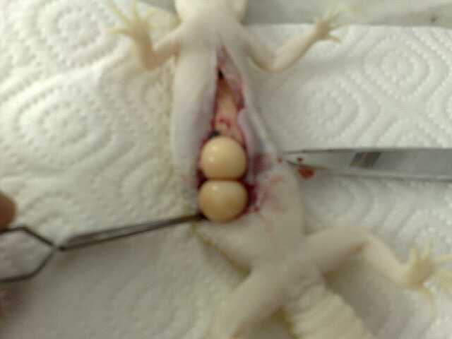 os dejo una foto del estomago de la hembra para ver que opinais y una foto de sus dos huevos que mea puesto son los 2 mas grandes los otros son tanbien de euble mirar que diferencia entre unos y otros.