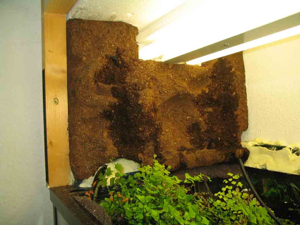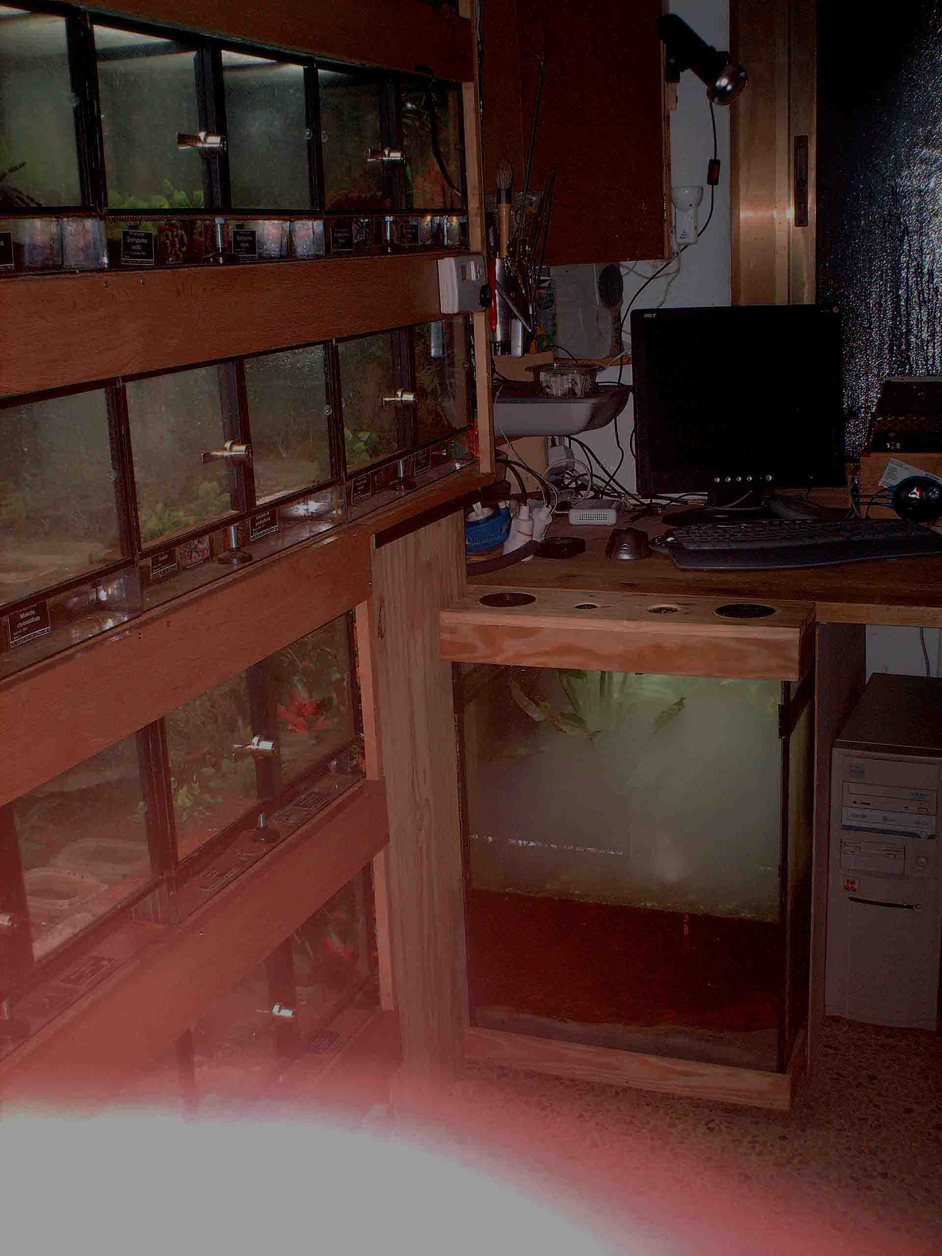 Encuanto a la iluminación tengo dos.... una tenue... bombillas de pesebre que estan en la pared y un flourescente de 1.50 de aupa que enciendo para alimentar y limpiar....que esta justo en la tira de madera.