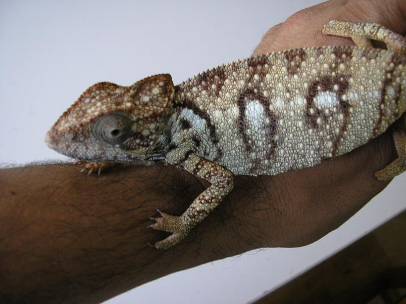 Pues pongo algunas fotos de uno de los camaleones de mayor tamaño asi como de los mas pacificos usados en Madagascar para eliminar insectos en sus cabañas ya que se adaptan a convivir con el hombre.