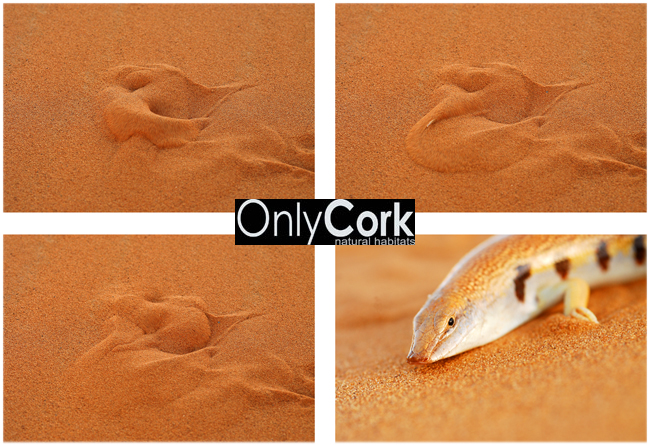 al final uno ve un "garabato" en la arena como la foto primera, y dejajo de la arena al protagonista Scincus albifasciatus laterimaculatus,una preciosidad y una prueba de la adaptación sin igual. Pez de arena.