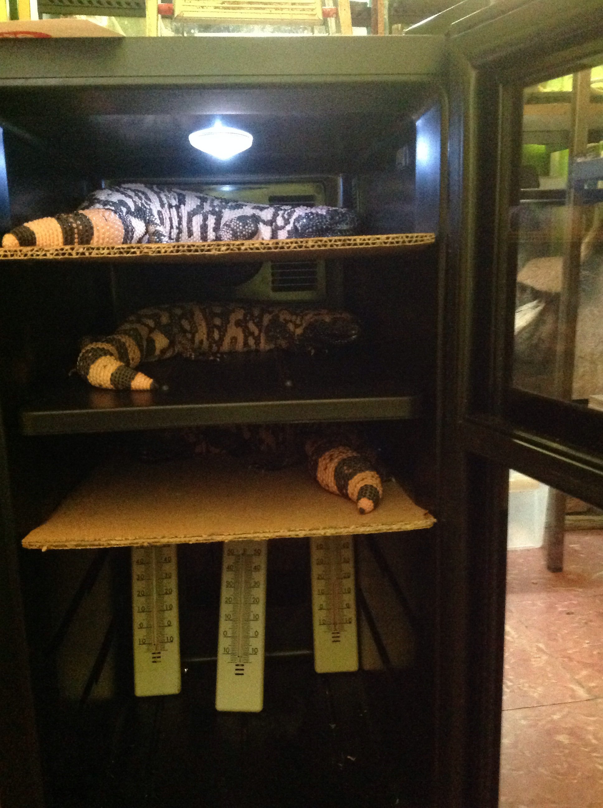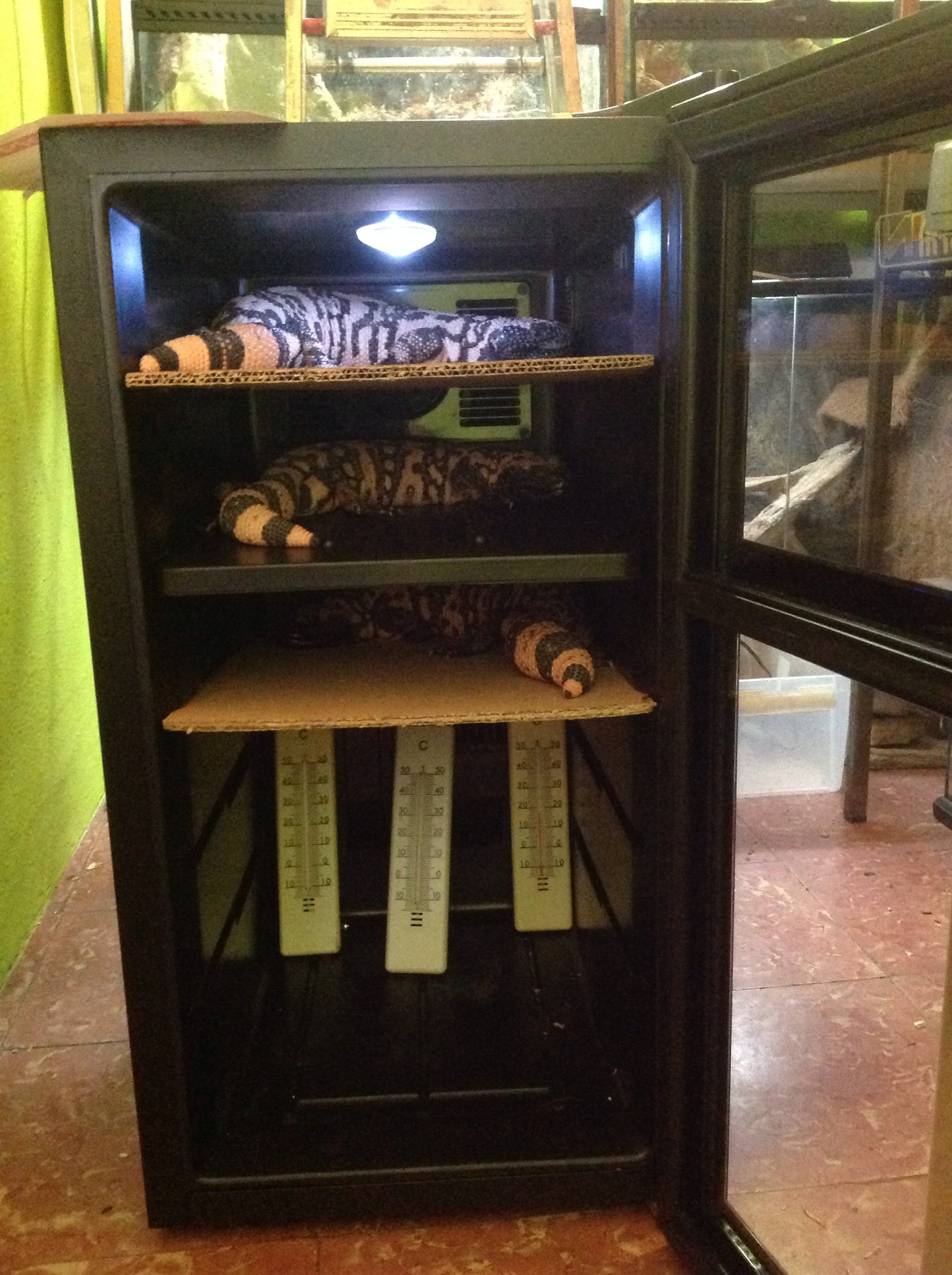 Hola. Este año me he decantado por hibernar a mis heloderrmas en una vinoteca, ya que en Barcelona las temperaturas en invierno canvian mucho desde la mañana hasta la noche. Por espacio tengo que hacer unas estanterias dentro de la vinoteca y poner a los helodermas uno por uno en cada estante como se puede ver en las fotos. que opinais? Creeis que puede ser peligroso para ellos el ambiente que crea la vinoteca?