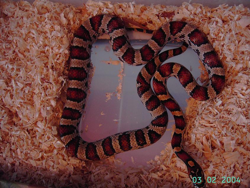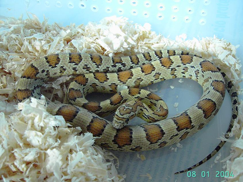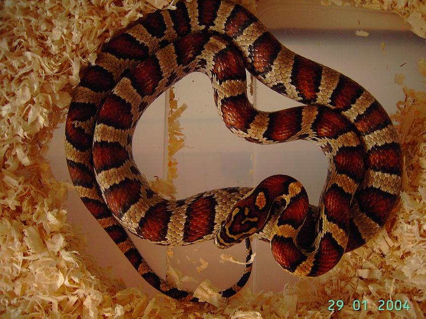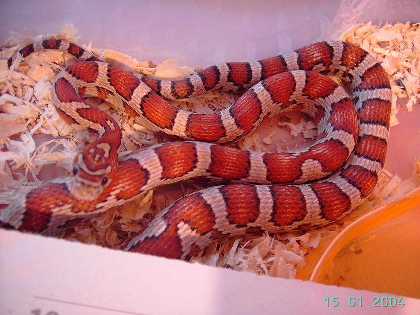 -Seleccion de patron: Juntar una pareja con el patron mas parecido. Aqui has de elegir si prefieres tirar a las serpientes bandeadas (seria mas bonito)o a serpientes manchadas (con sillas o monturas. Unas supercorn que tienen mas parecido a guttatus que a cali, le pega algo mas bonito como bandas (para mi gusto, al menos en los albinos)